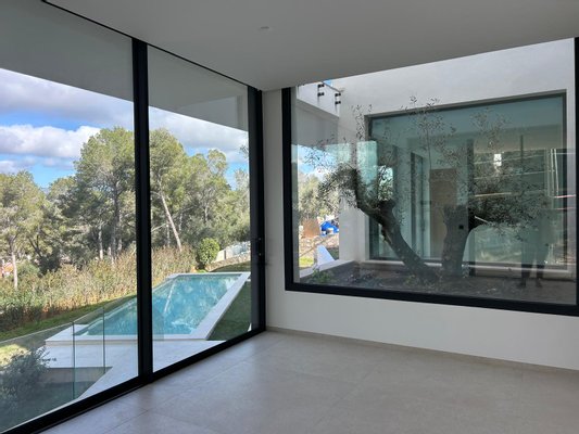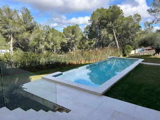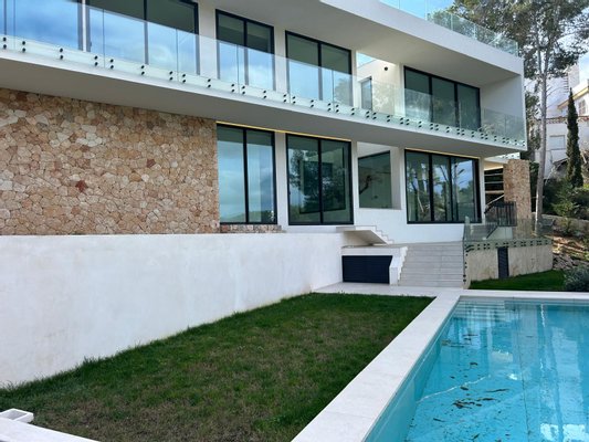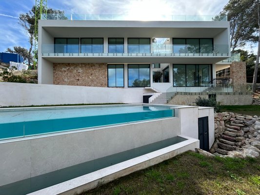Diese top Neubau - Villa befindet sich auf einem erhöhten Grundstück in Santa Ponsa und kombiniert perfekt mediterrane und moderne Bauelemente.
