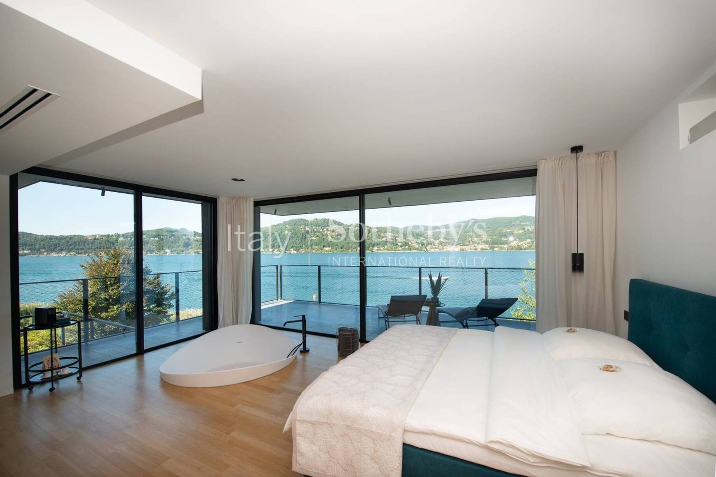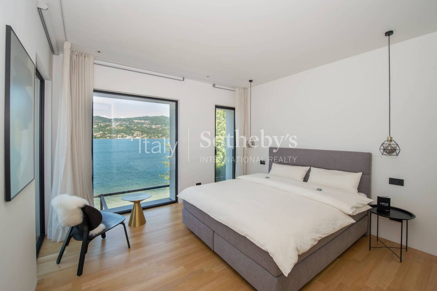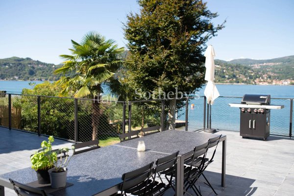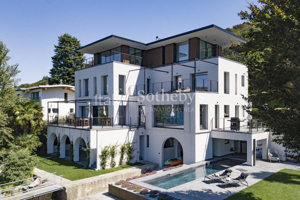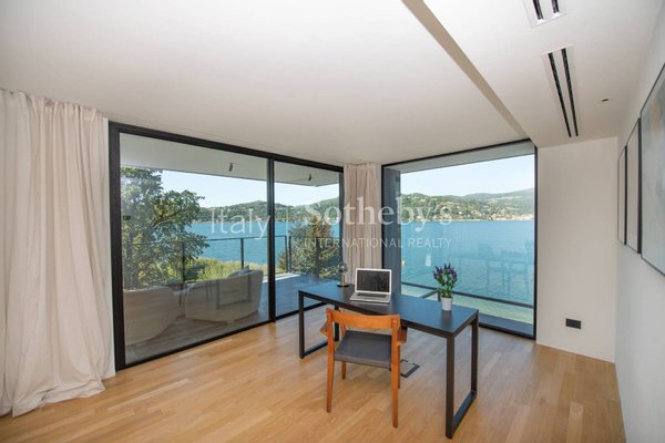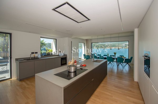 Die Villa erstreckt sich über vier Ebenen, die durch einen internen Aufzug miteinander verbunden sind, und überzeugt durch helle, funktionale Räume. Auf der Hauptebene befinden sich zwei Küchen, die in ein Panorama-Esszimmer mit Seeblick übergehen. Das großzügige und elegante Wohnzimmer wird durch einen stilvollen, doppelseitigen Kamin veredelt. Im Außenbereich lädt eine möblierte Terrasse dazu ein, entspannte Momente in absoluter Ruhe zu genießen.