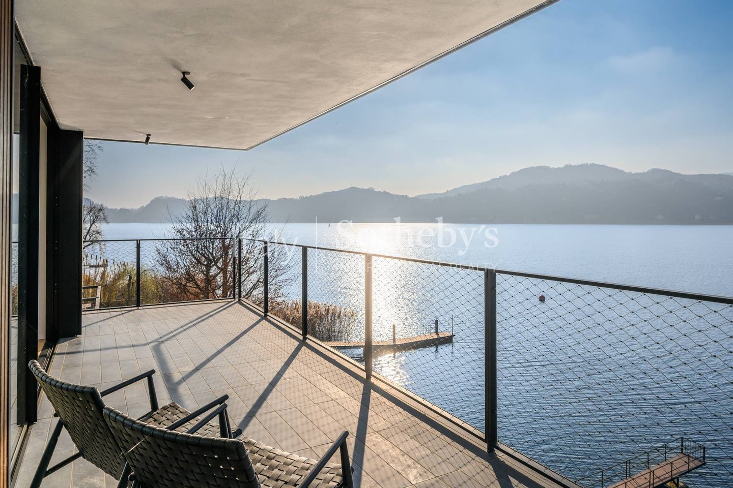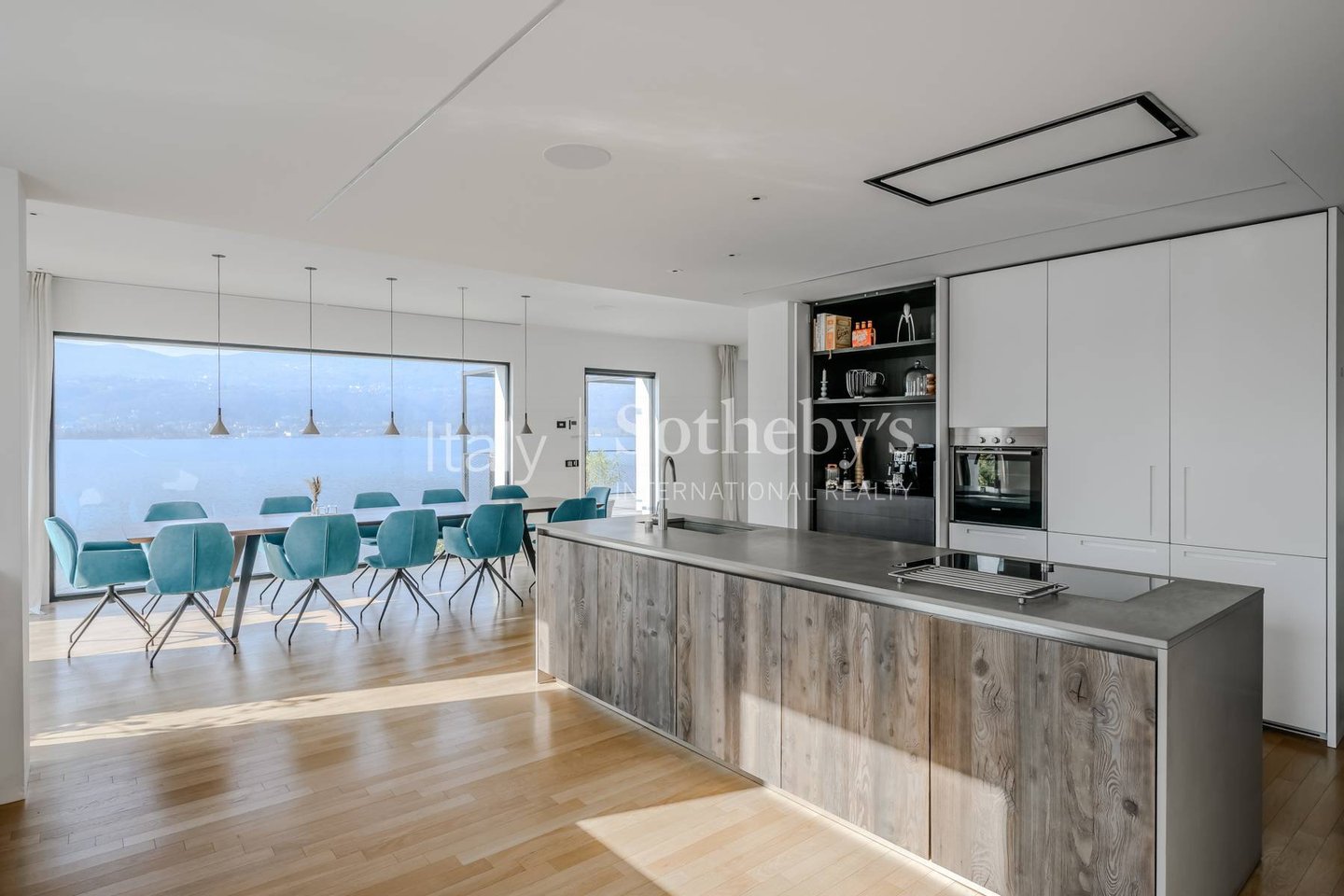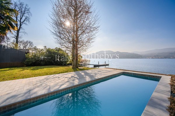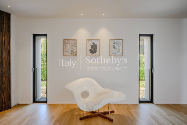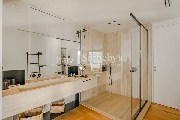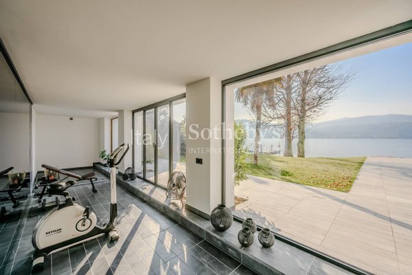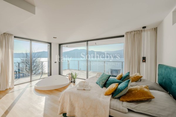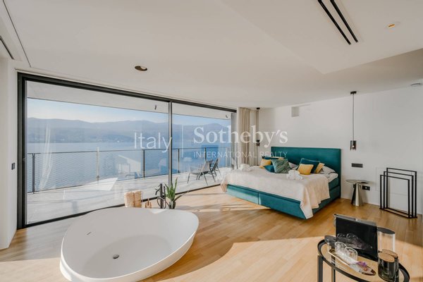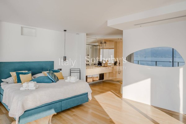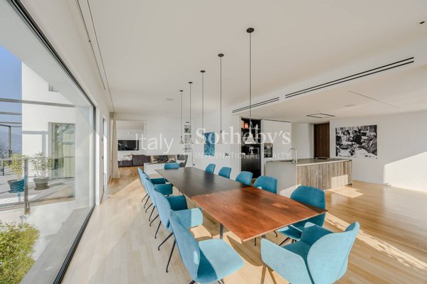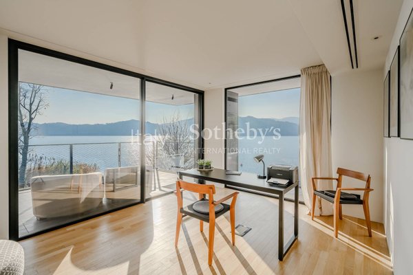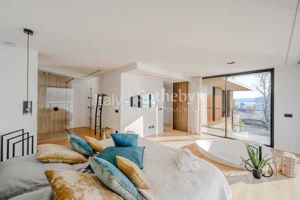 Die Villa erstreckt sich über vier Ebenen, die durch einen internen Aufzug miteinander verbunden sind, und überzeugt durch helle, funktionale Räume. Auf der Hauptebene befinden sich zwei Küchen, die in ein Panorama-Esszimmer mit Seeblick übergehen. Das großzügige und elegante Wohnzimmer wird durch einen stilvollen, doppelseitigen Kamin veredelt. Im Außenbereich lädt eine möblierte Terrasse dazu ein, entspannte Momente in absoluter Ruhe zu genießen.