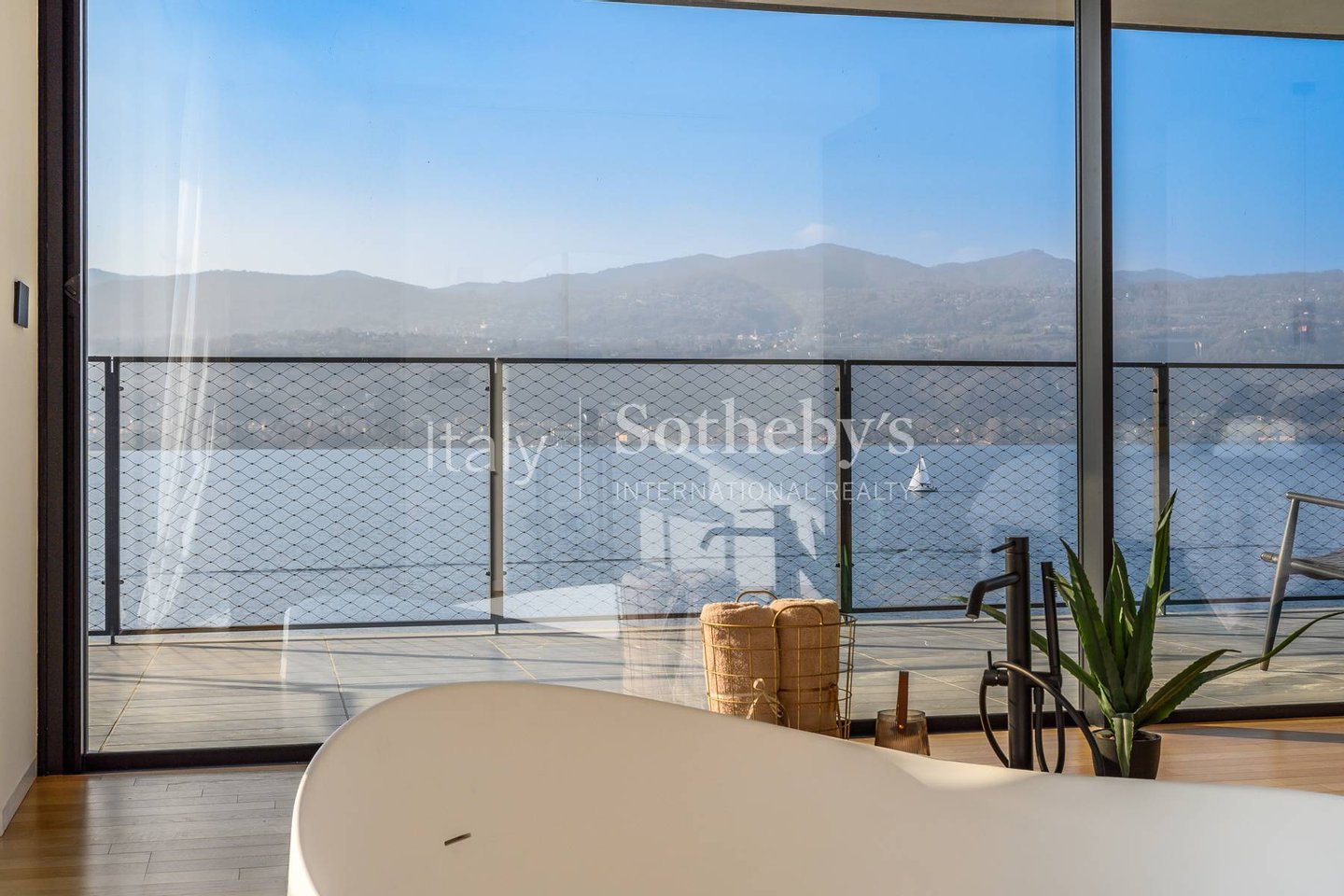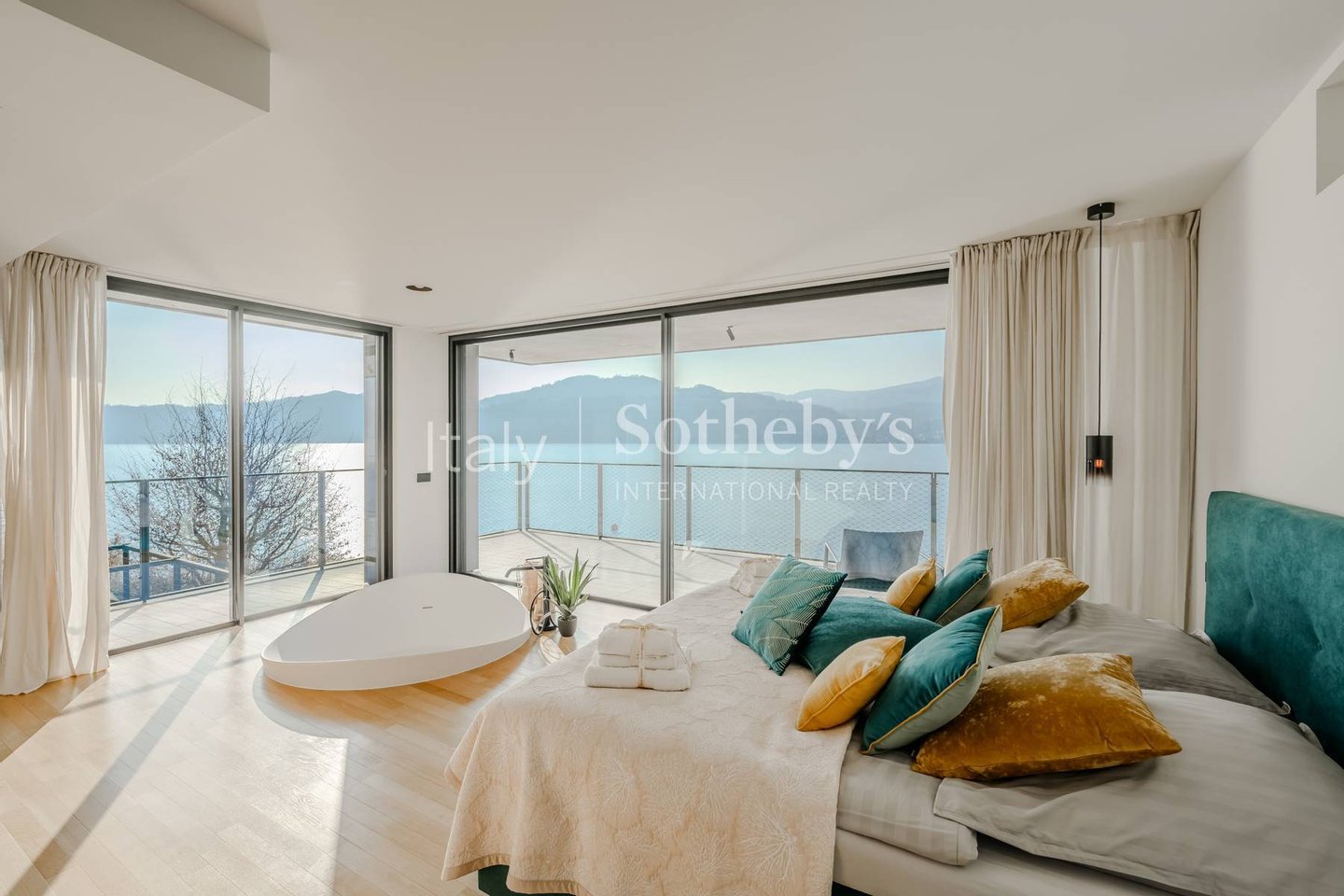 Im obersten Geschoss befindet sich die Master-Suite mit Seeblick, einem Badezimmer mit Badewanne und Dusche, einem privaten Arbeitszimmer sowie einer überdachten Panoramaterrasse mit weitem Blick über die umliegende Landschaft.