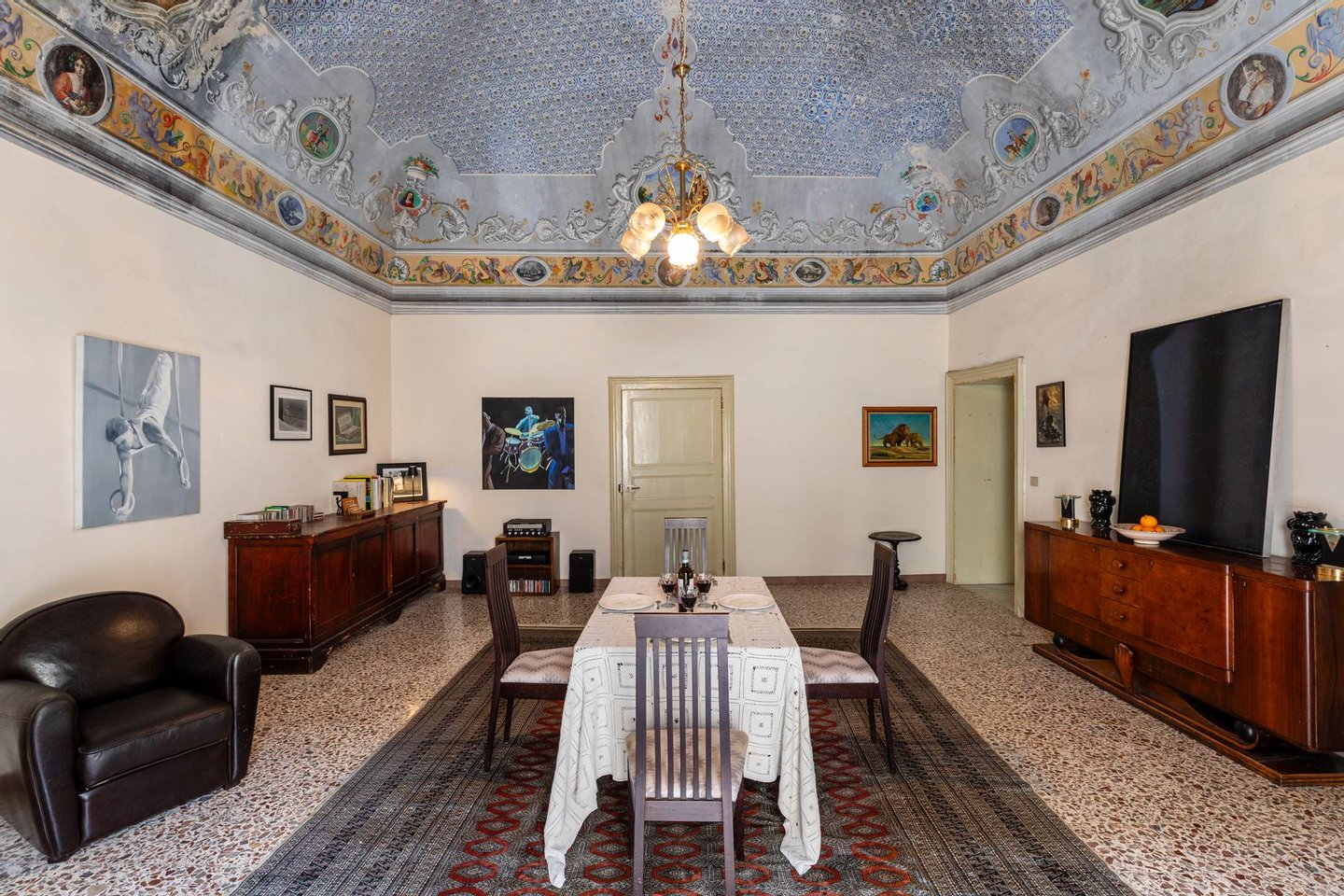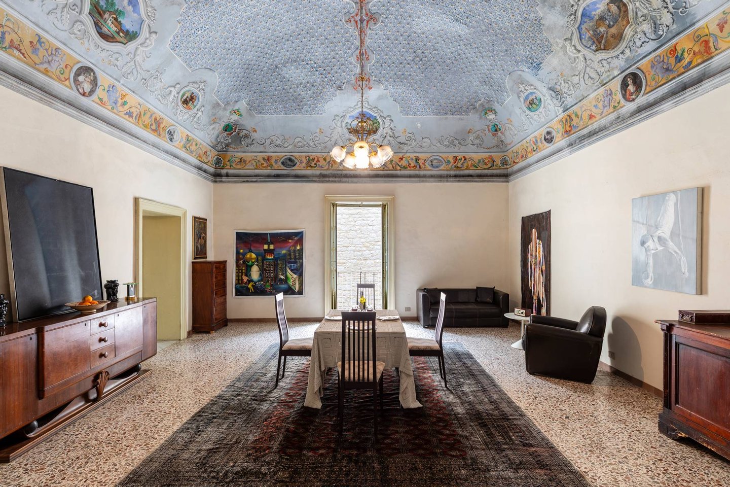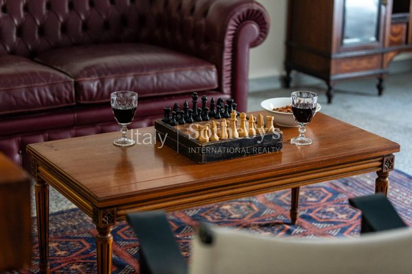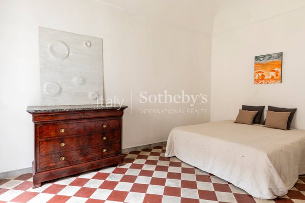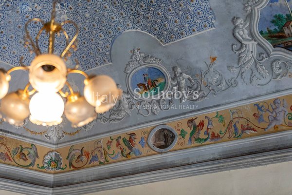 Der Eingangsbereich führt zu zwei großen repräsentativen Salons mit prachtvollen historischen Gewölbedecken. Auf dieser Ebene befinden sich zudem ein Atelier, ein weiterer Raum mit vorbereiteten Anschlüssen für eine Küche sowie ein Badezimmer. Eine Treppe aus Pietra Pece führt in das zweite Obergeschoss, das zwei Schlafzimmer, einen Salon und ein weiteres Badezimmer beherbergt und mit originalen historischen Bodenbelägen ausgestattet ist.