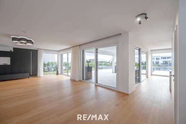 - Großzügiger Wohn- und Essbereich mit direktem Zugang zu Terrasse, Garten, Pool und See