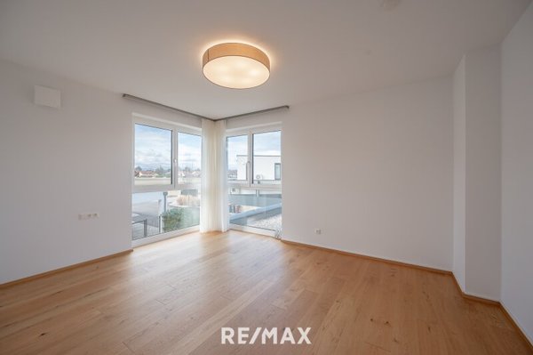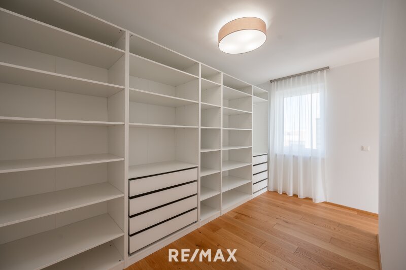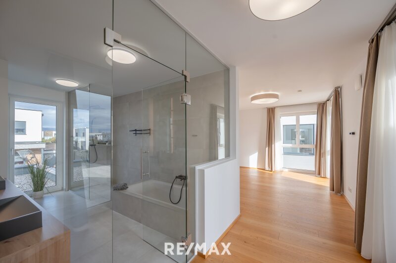 Im Obergeschoss erwartet Sie eine private Rückzugsebene mit Master-Bedroom samt Schrankraum, zwei weiteren Zimmern sowie zwei eleganten Bädern – eines mit Dusche, eines mit Dusche und Badewanne sowie jeweils integrierter Toilette. Von der großen Sonnenterrasse hat man einen traumhaften Blick über den See, den glasklaren Pool und das gepflegte Grundstück.
