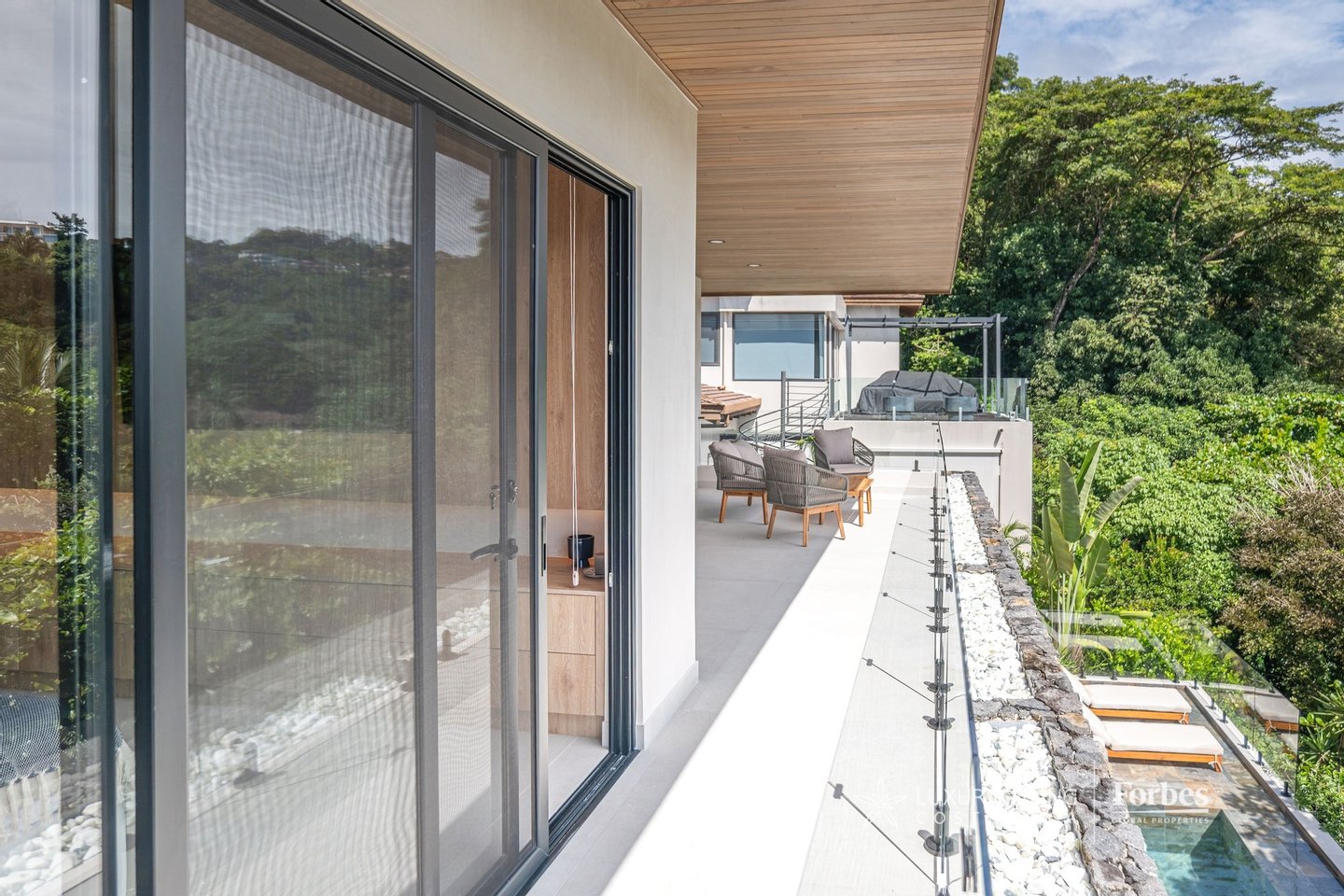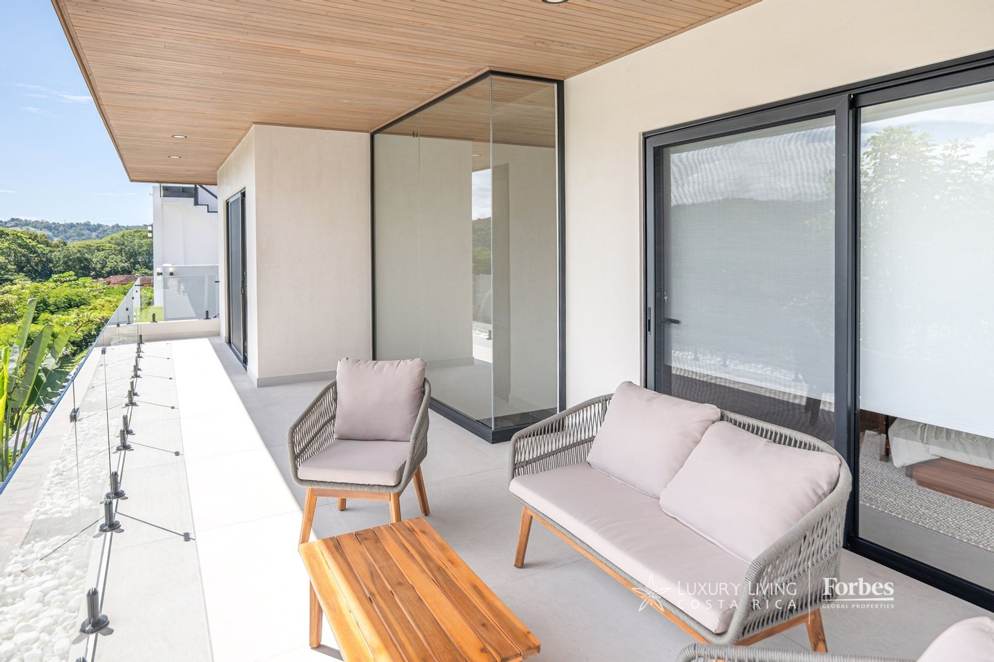 Die Residenz verfügt über fünf gut ausgestattete Schlafzimmer, jedes mit eigenem Bad und Klimaanlage, sowie über ein separates Service-Schlafzimmer. Eines der Hauptschlafzimmer befindet sich günstig im Erdgeschoss und sorgt für Komfort und Zugänglichkeit. Die Master-Suite zeichnet sich durch einen großzügigen begehbaren Kleiderschrank und eine private Terrasse aus, die einen atemberaubenden Blick auf die umliegende Landschaft bietet. Dieser weitläufige Außenbereich wird mit einem angrenzenden Schlafzimmer geteilt, wodurch eine nahtlose Erweiterung beider Räume und ein ruhiger Rückzugsort entsteht, der sich ideal zum Entspannen oder Unterhalten eignet. Von diesem Aussichtspunkt aus bietet die Terrasse einen Panoramablick auf die Berge, üppiges Grün und die Siedlung Los Sueños, die die Verbindung des Hauses zu seiner natürlichen Umgebung vertieft.