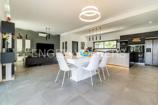 Der große, offene Wohnbereich ist das Herzstück des Hauses. Er umfasst ein elegantes Wohn- und Esszimmer, das durch eine moderne Designerküche veredelt wird, die sich perfekt zum Empfangen und Teilen geselliger Momente eignet.