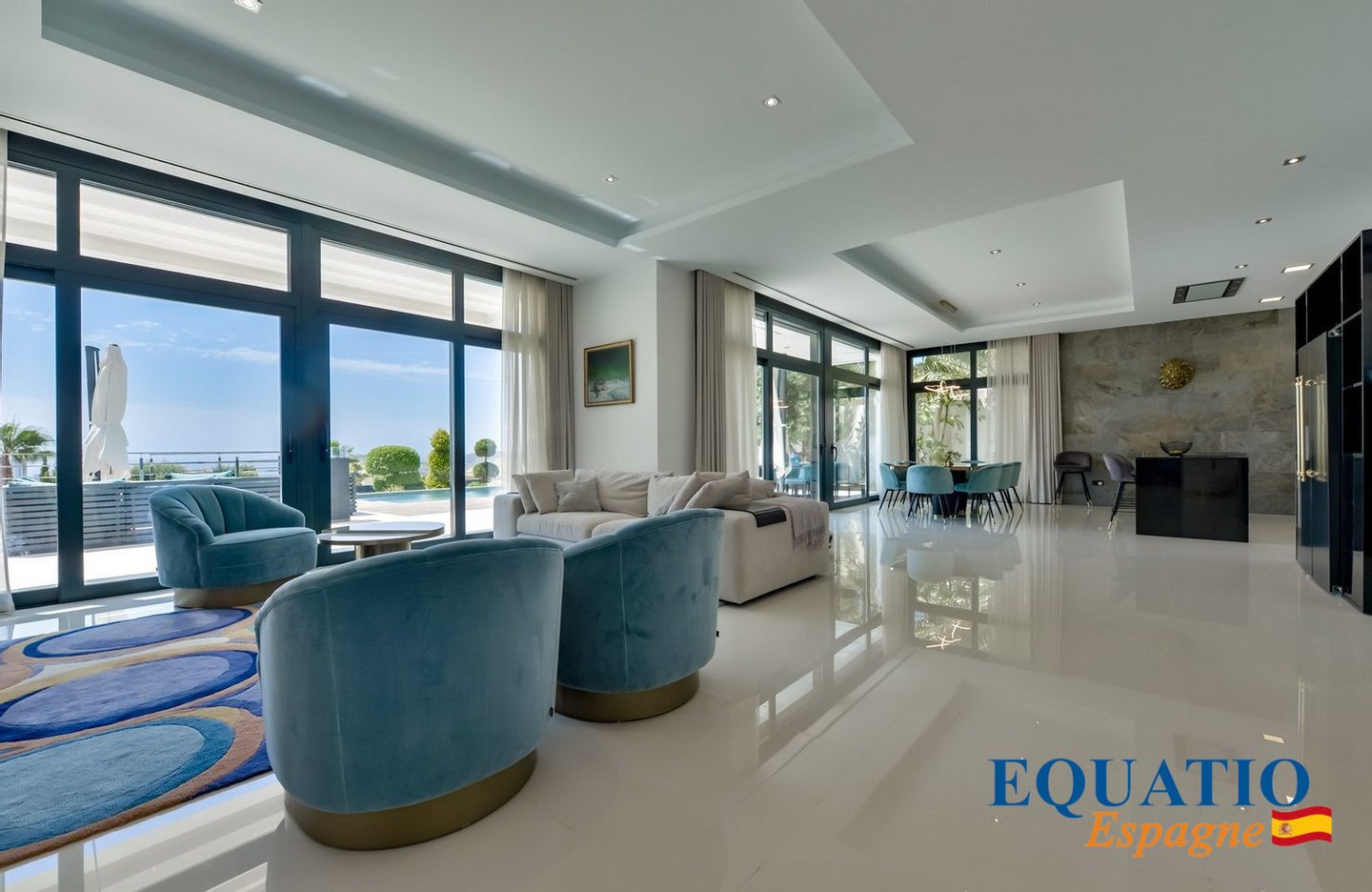 Riesige, offene Küche mit zentraler Insel, voll ausgestattet und ausgestattet, verbunden mit Wohn- und Essbereich.