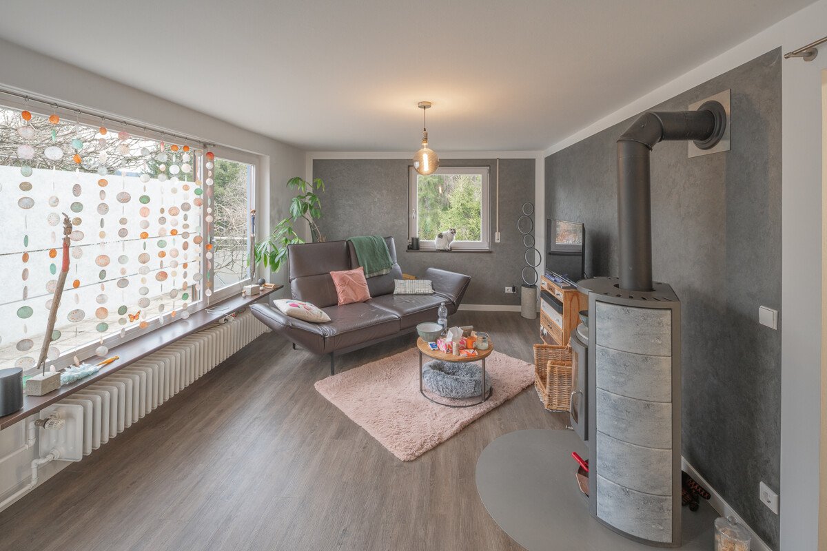 Für behagliche Stunden sorgt ein gemütlicher Kaminofen in der EG-Wohnung, der dem Wohnbereich eine warme Atmosphäre verleiht.