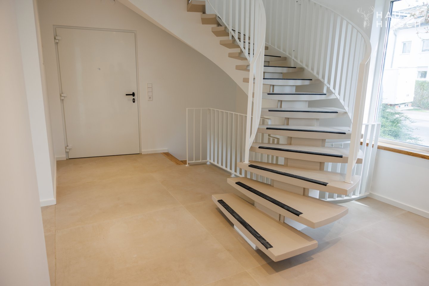 Die luxuriöse Ausstattung mit edlen Materialien, einer Designer-Treppe und Walk-in-Duschen lässt keine Wünsche offen. Auf insgesamt 4 Etagen erwarten Sie 8 Zimmer, darunter zwei mit separatem Eingang, die sich ideal als Atelier, Büro oder Einlieger - Apartment nutzen lassen.