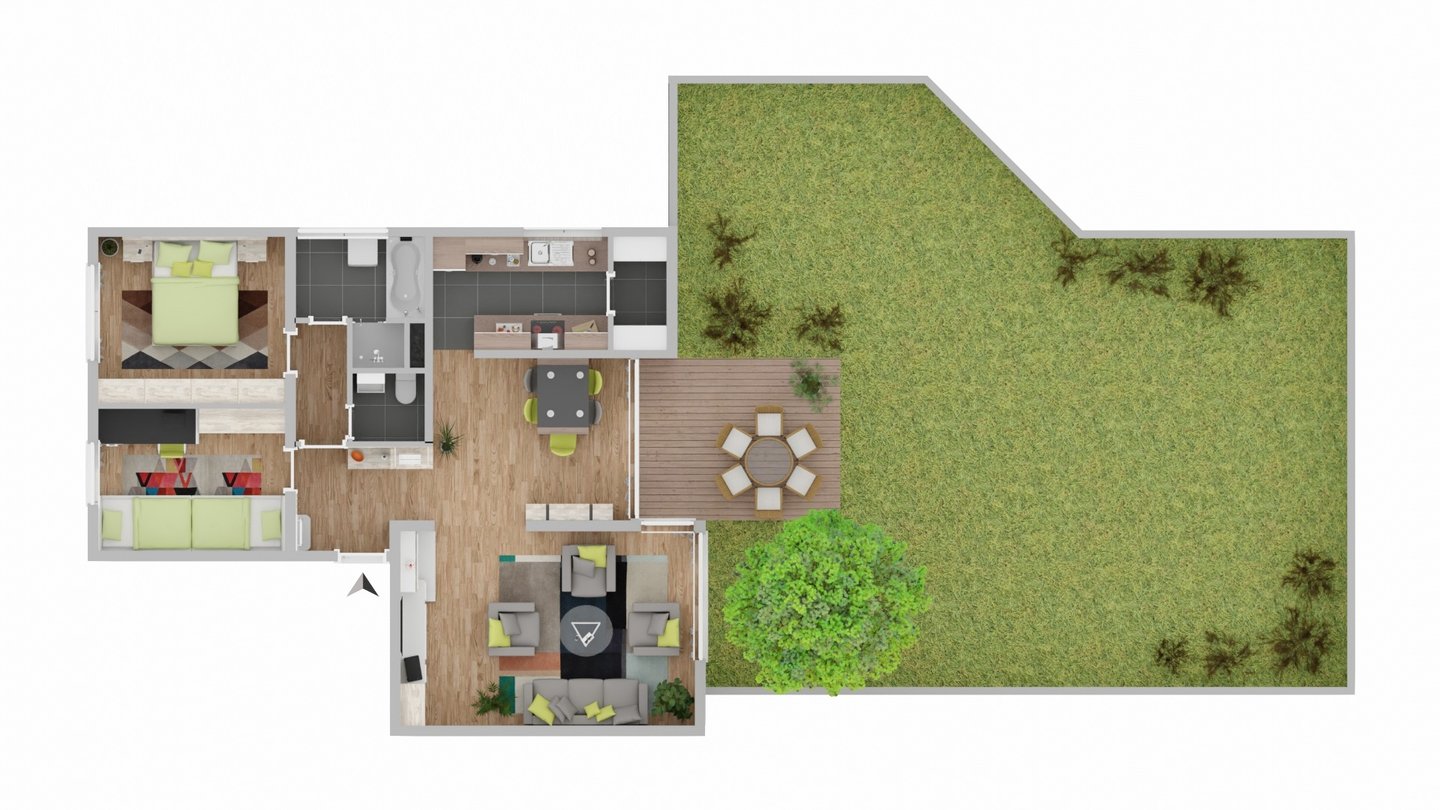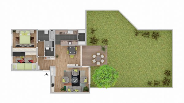Schon beim Betreten spürt man die Großzügigkeit der Wohnung. Der helle Wohn- und Essbereich bildet das Herzstück des täglichen Lebens und überzeugt durch eine offene Raumwirkung sowie große Fensterflächen, die den Raum mit Tageslicht durchfluten. Durch das einsetzen einer Wand kann hier zudem ein weiteres Zimmer hinzugefügt werden. Von hier aus öffnet sich auch der direkte Zugang zur überdachten Terrasse und dem weitläufigen privaten Garten.