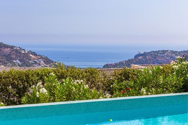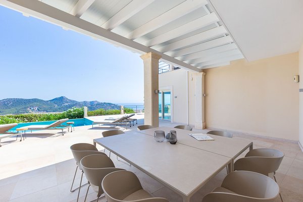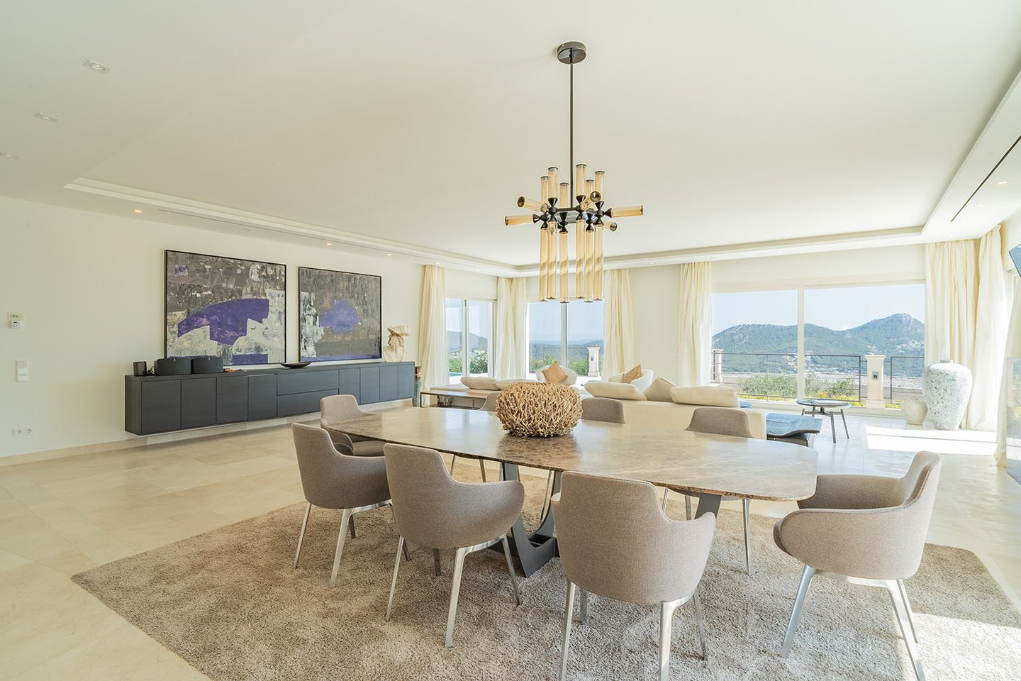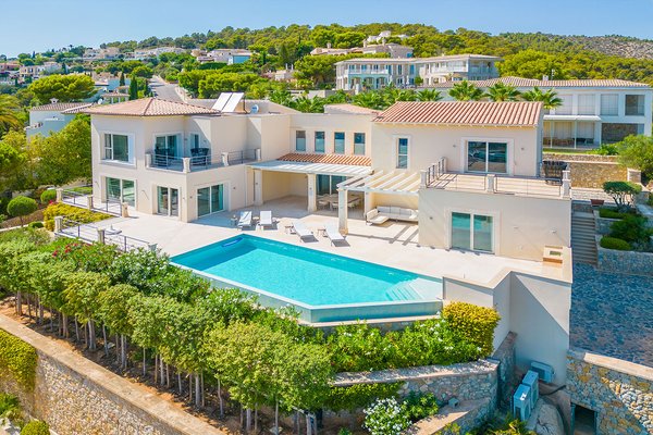 Diese großartige moderne Villa liegt im oberen Bereich des mondänen Villenviertels Montport oberhalb von Port Andratx und verfügt über einen sensationellen Panoramablick über die Bucht und die Halbinsel La Mola bis auf das Meer. Das helle, offene