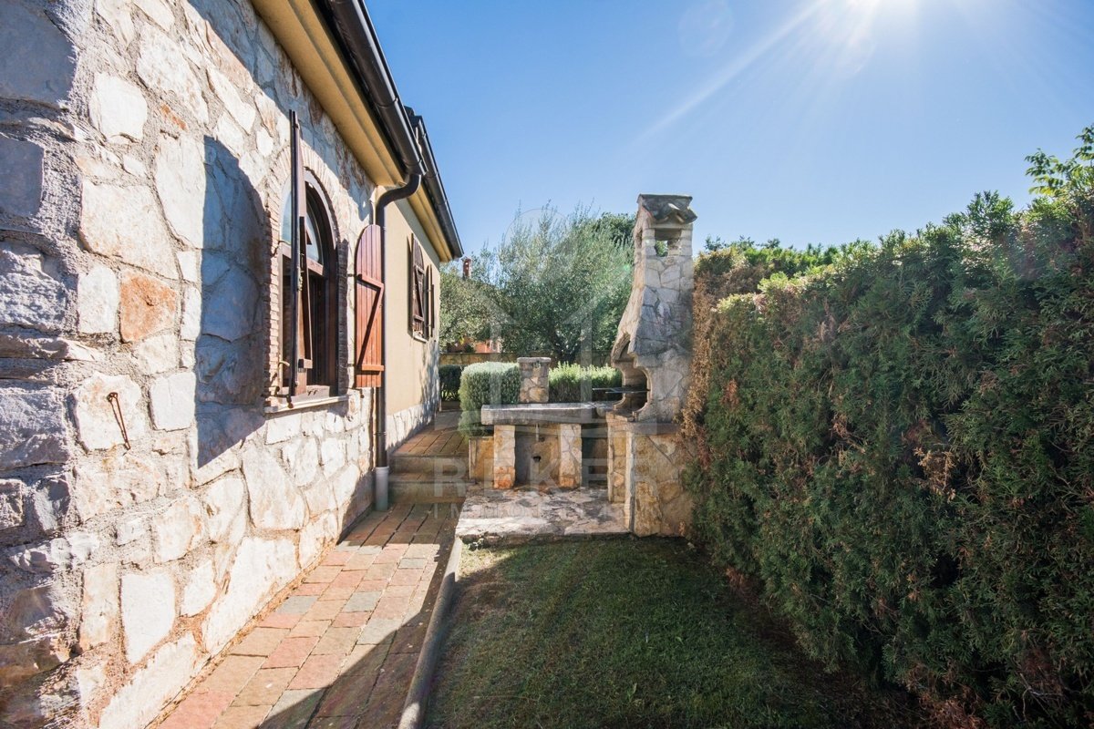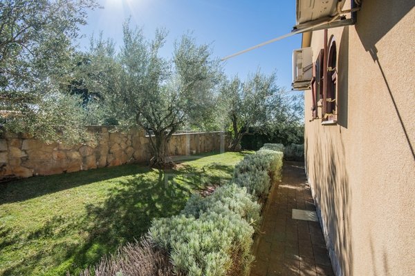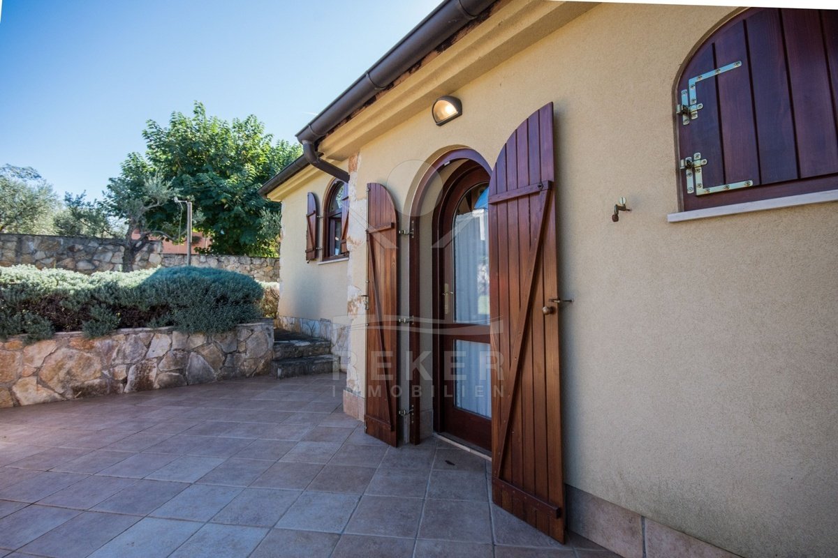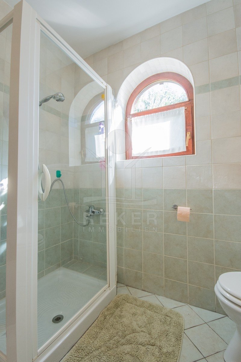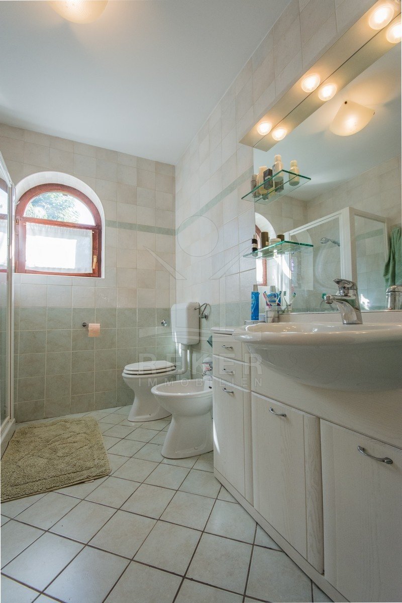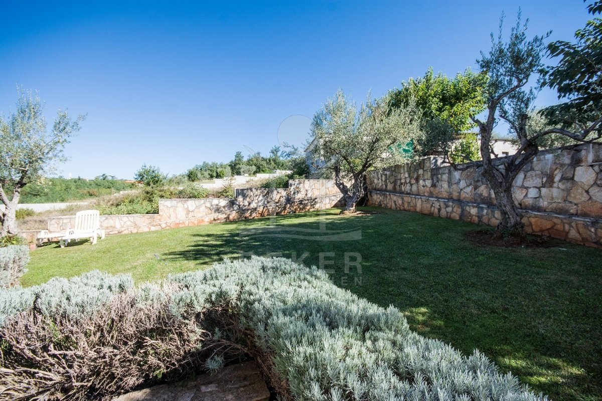 Auf einem Hügel in einem istrischen Ort nahe Poreč steht dieses gepflegte Einfamilienhaus mit weitem Panoramablick auf das Meer. Die Strände erreichen Sie nach rund 10.000 m. Einkaufsmöglichkeiten, Schule und Stadtzentrum sind gut angebunden. Obwohl das Haus baulich als Doppelhaushälfte ausgeführt ist, nutzen Sie eine eigene Zufahrt und einen separaten Zugang. Das sorgt für spürbare Privatsphäre. Auf dem 400 m² großen Grundstück stehen gepflasterte Stellflächen und eine Garage zur Verfügung.