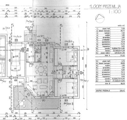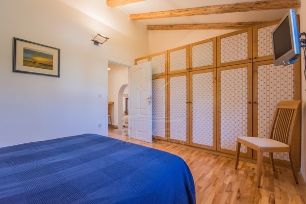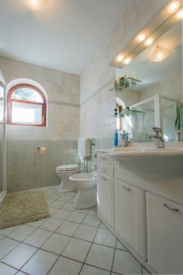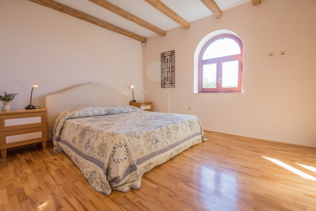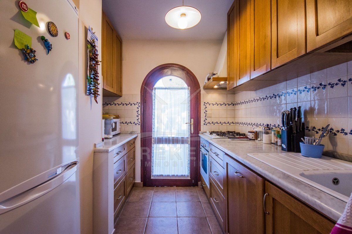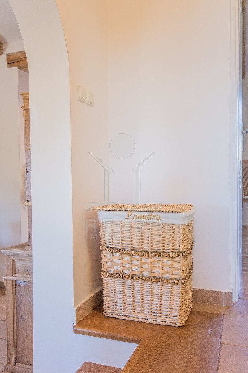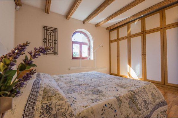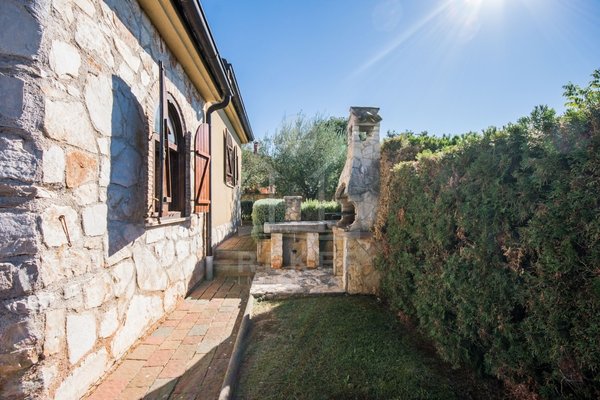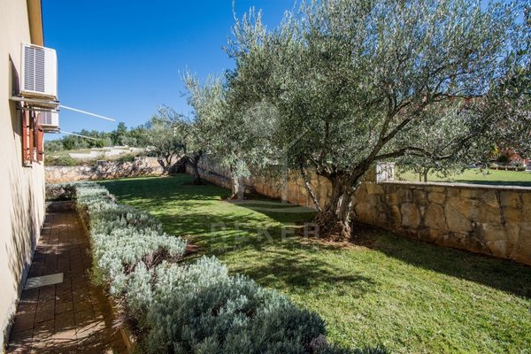 Auf einem Hügel in einem istrischen Ort nahe Poreč steht dieses gepflegte Einfamilienhaus mit weitem Panoramablick auf das Meer. Die Strände erreichen Sie nach rund 10.000 m. Einkaufsmöglichkeiten, Schule und Stadtzentrum sind gut angebunden. Obwohl das Haus baulich als Doppelhaushälfte ausgeführt ist, nutzen Sie eine eigene Zufahrt und einen separaten Zugang. Das sorgt für spürbare Privatsphäre. Auf dem 400 m² großen Grundstück stehen gepflasterte Stellflächen und eine Garage zur Verfügung.