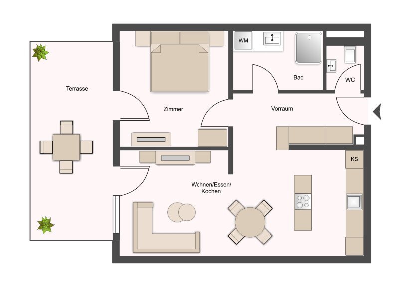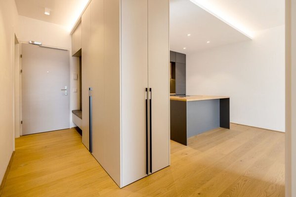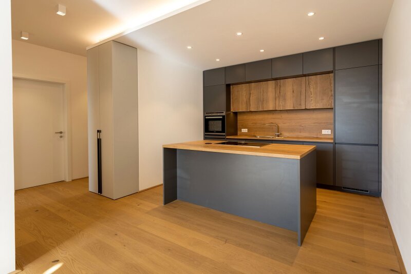 Die Wohnung hat eine optimale Raumaufteilung: einen offenen Wohn-Ess-Kochbereich mit Kücheninsel, ein Schlafzimmer, ein Bad mit Dusche, ein separates WC und einen geräumigen Garderobenbereich.