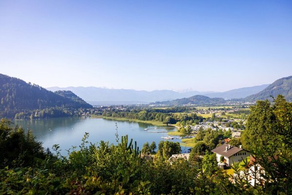 Der fesselnde Panoramablick schweift über die großzügige Terrasse, welche von der Sonne verwöhnt wird, zum davorliegenden Ossiacher See, die Burg Landskorn und die traumhaften Berge.