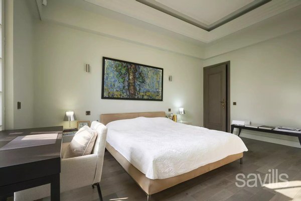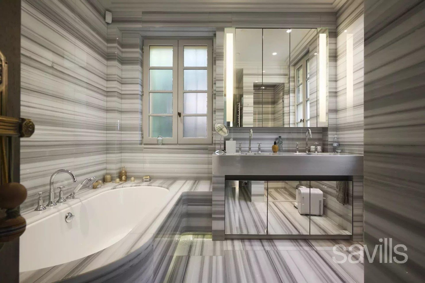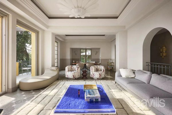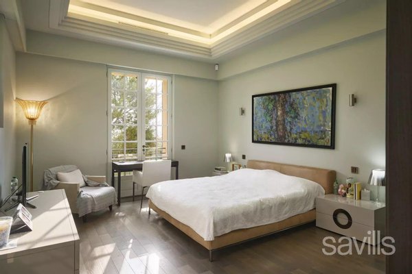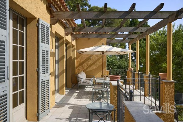 Im Inneren öffnen sich die Wohnräume — Empfangsraum und Esszimmer — auf eine große Panoramaterrasse mit Blick auf das Meer, die elegante französische Natursteinböden aufweist. Die fünf geräumigen Schlafzimmer verfügen jeweils über ein eigenes Ankleidezimmer und ein Badezimmer en suite, ergänzt durch hochwertigen Parkettboden aus Massivholz.