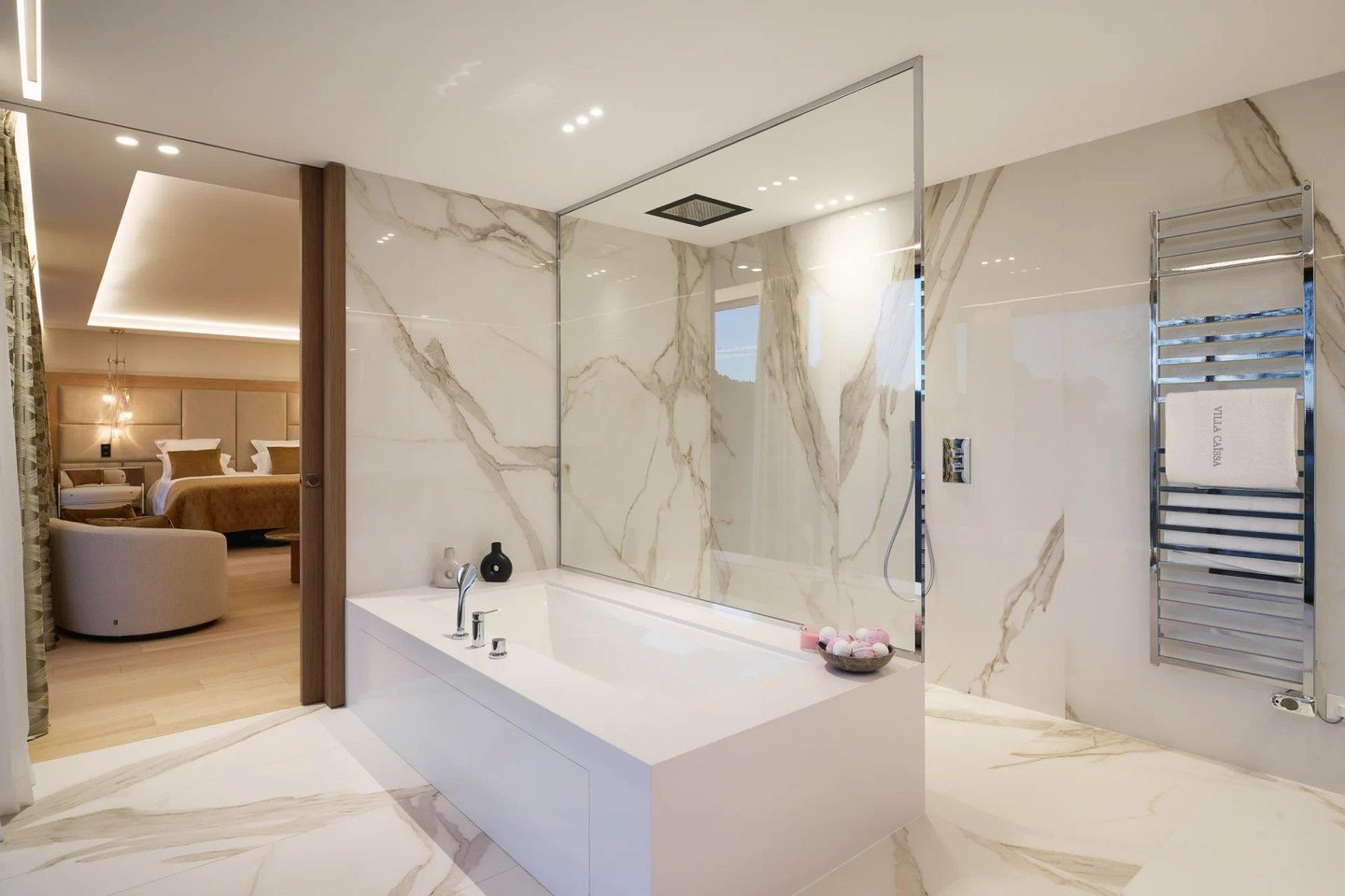 Cannes, Super-Cannes. Entdecken Sie diese außergewöhnliche Villa, kürzlich erbaut, mit einem Wohnraum von 560 m² und hochwertiger Ausstattung. Auf einem flachen Grundstück von 2207 m², vollständig nach Süden ausgerichtet, bietet sie einen Panoramablick aufs Meer, einen eleganten Außenpool und eine Boule-Bahn für gesellige Stunden im Freien. Vom Eingang aus offenbart das Erdgeschoss eine geräumige Halle mit Garderobe und Gäste-WC. Sie genießen ein großes lichtdurchflutetes Wohnzimmer, ein einladendes Esszimmer und eine offene Küche im zeitgenössischen Design sowie zwei en-suite Schlafzimmer mit Blick auf die Berge. Im Obergeschoss warten zwei weitere en-suite Schlafzimmer, ein elegantes Arbeitszimmer und eine prächtige Hauptsuite mit zwei Ankleidezimmern, einem raffinierten Badezimmer und separaten Toiletten auf. Zur Abrundung dieses außergewöhnlichen Rahmens bietet ein ausgebautes Untergeschoss Freizeit- und Erholungsräume: ein Kino, ein Fitnessraum, ein Hallenbad und eine Sauna. Eine Garage für drei Autos sowie zwei weitere Parkplätze auf dem Grundstück erhöhen die Funktionalität dieser außergewöhnlichen Villa.