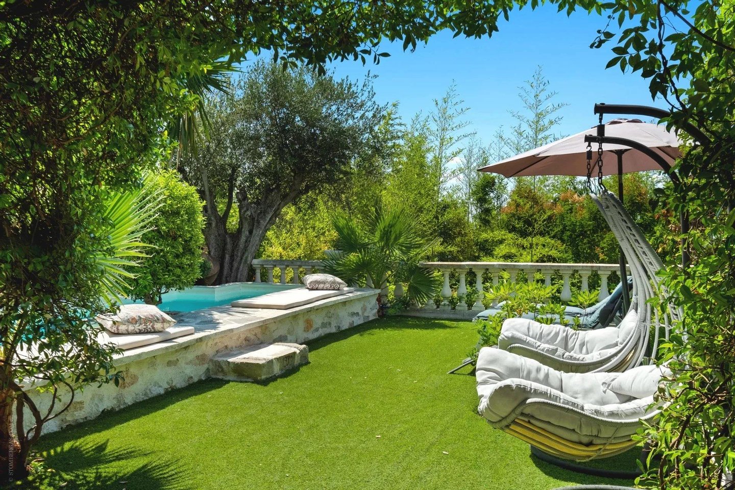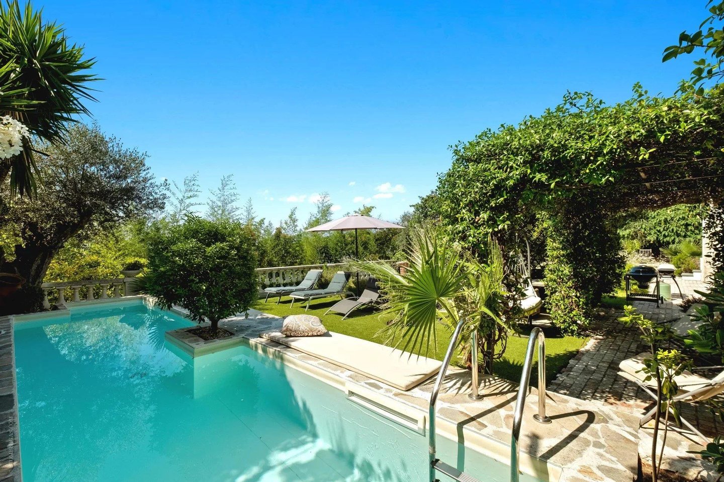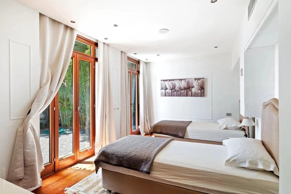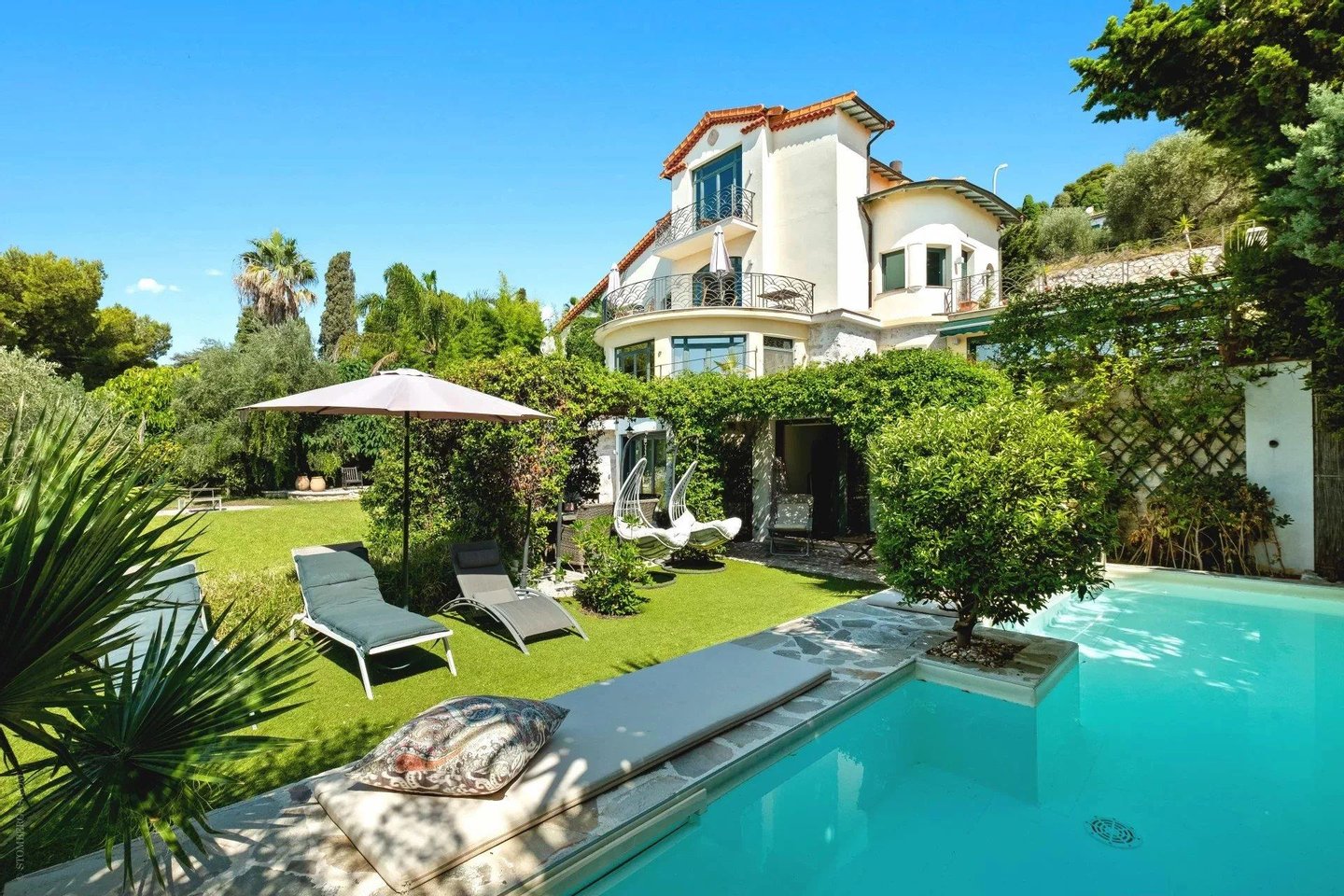 Die ca. 450 m² große Immobilie erstreckt sich über vier Ebenen, die durch einen Aufzug bedient werden. Das Anwesen liegt auf einem 1.000 m² großen Grundstück und bietet herrliche Außenbereiche: weite Terrassen, Pool, flacher 500 m² großer Garten und Solarium, um die mediterrane Sonne in vollem Umfang zu genießen.