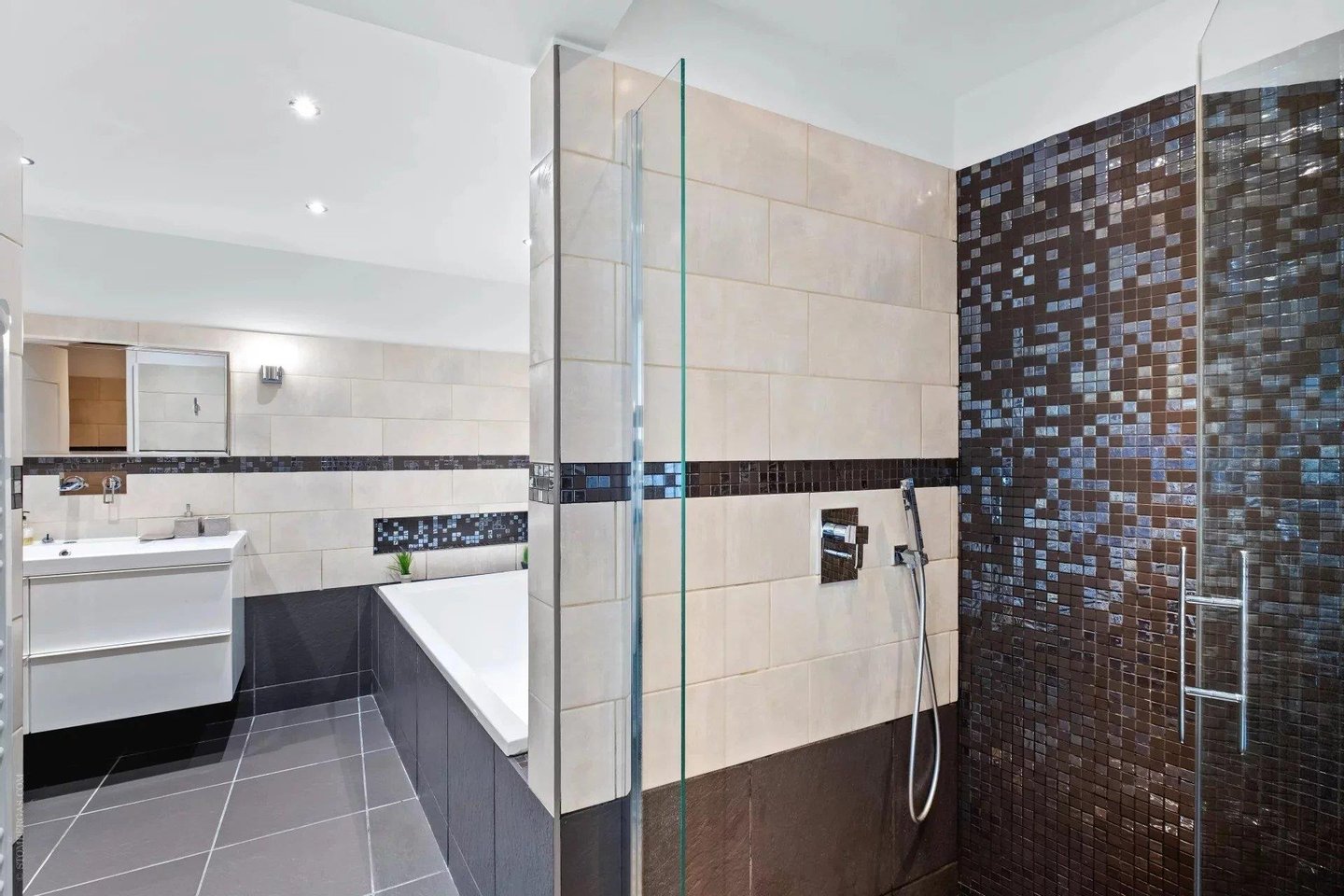 Erdgeschoss: ein wohnliches und elegantes Offenerleben mit moderner Küche, hellen Aufenthaltsräumen, einer Bar, einem Badezimmer, einem Fitnessraum und einer Sauna. Der Aufzug ermöglicht einfachen Zugang zu allen Ebenen.
