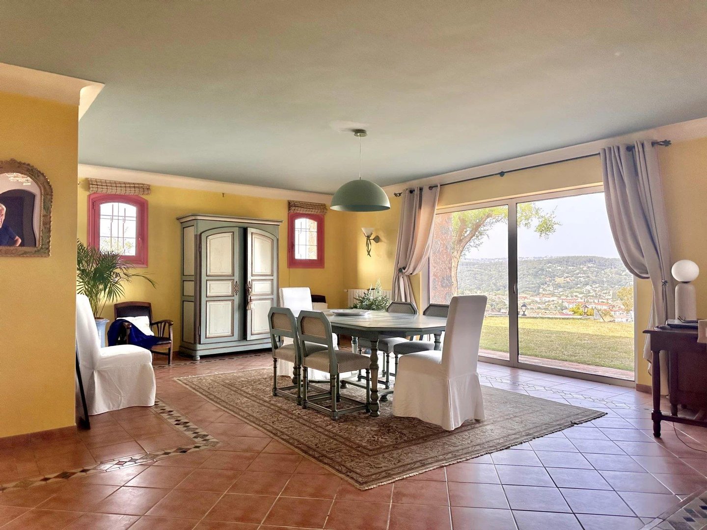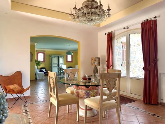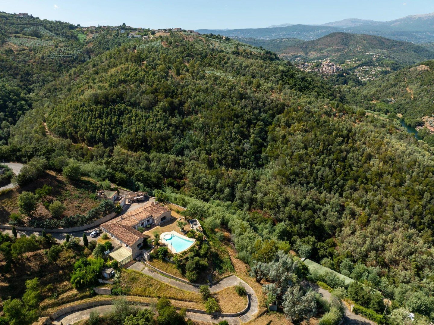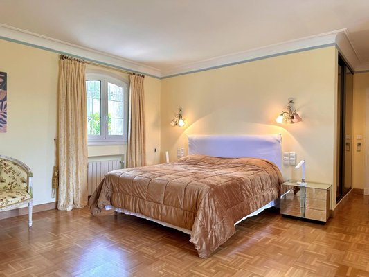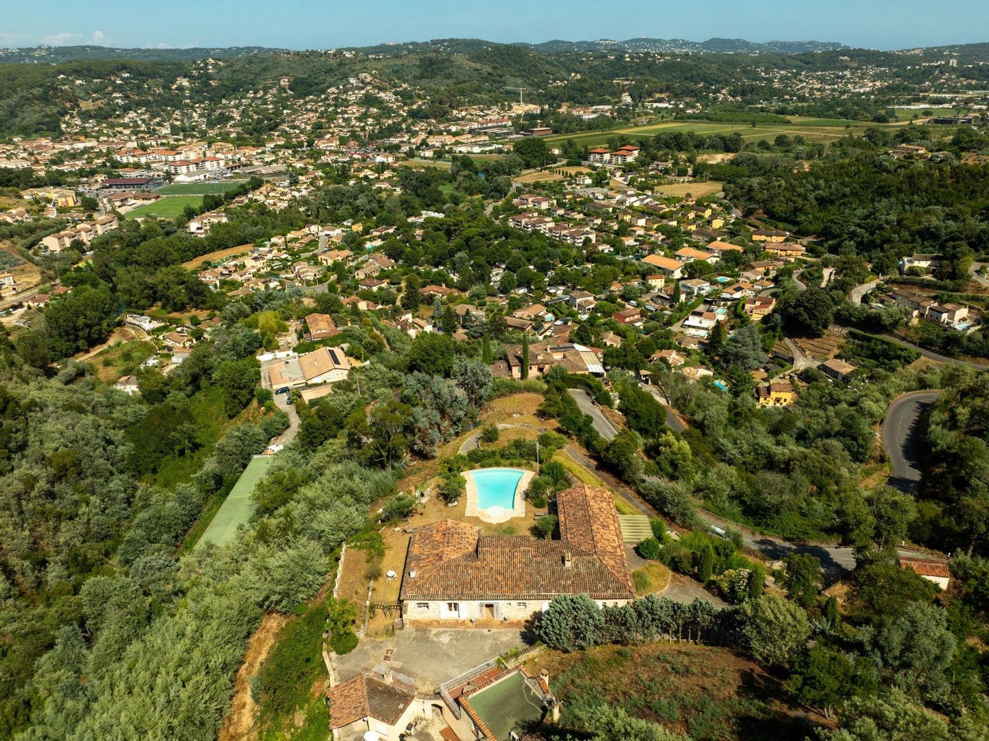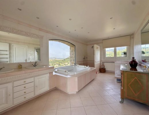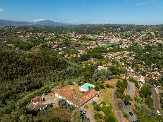 Die Villa bietet einen Panorama-Blick auf das Massiv der Gréolières sowie einen ersten Meerblick, bleibt jedoch in der Nähe des Internationalen Flughafens Cannes-Mandelieu.