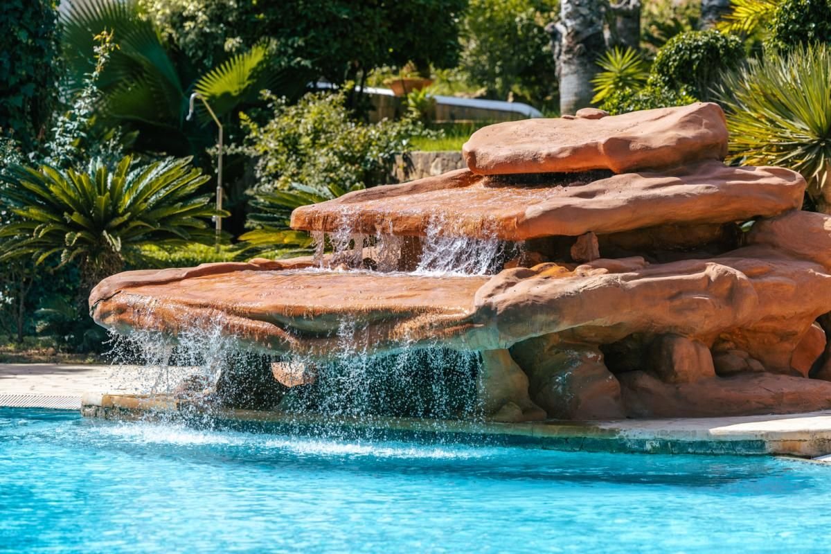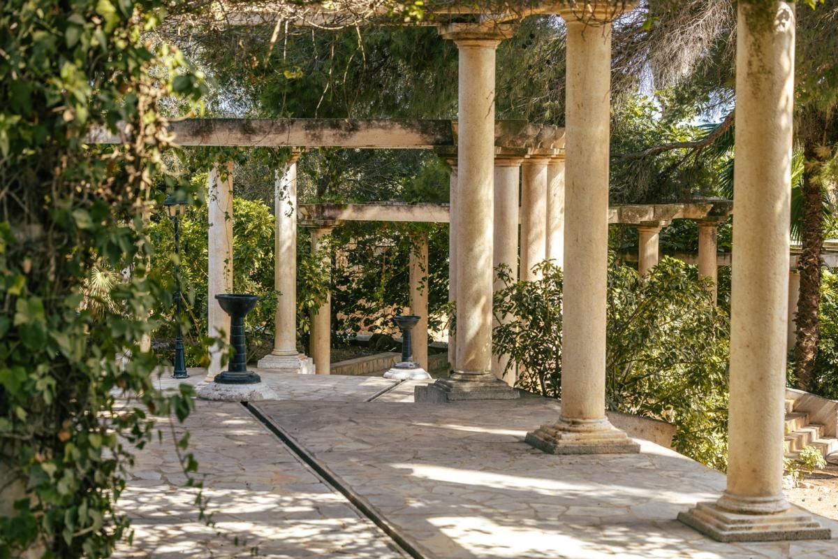 Die Villa öffnet sich zu ausgedehnten Terrassen mit Blick auf die Gärten, wo eine Treppe zu einem 385 m² großen Schwimmbecken mit Wasserfall, Gegenstromanlage und elegantem Grillbereich führt. Die Gärten sind sorgfältig gestaltet, mit Rastecken, Brunnen und einem kleinen Gemüsegarten mit Gemüse- und Obstbäumen.