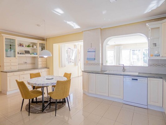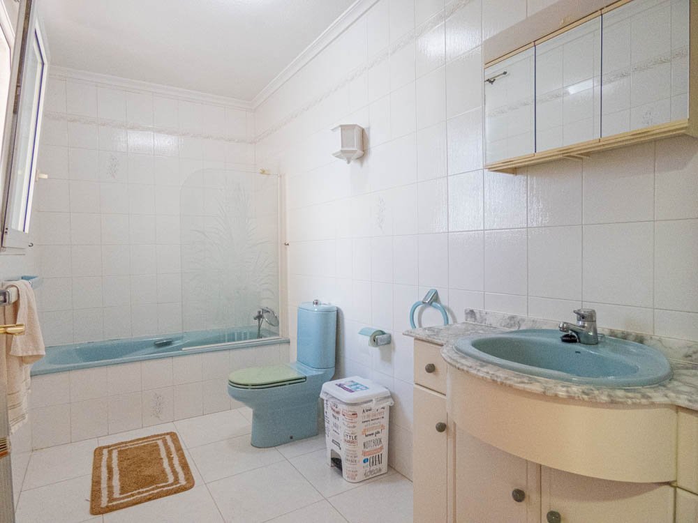 Wenn Sie die Treppe hinuntergehen, durch die Küche und nach draußen gelangen Sie auf eine untere Terrasse mit Blick auf den Pool. Links von diesem Bereich befindet sich ein weiteres Badezimmer.
