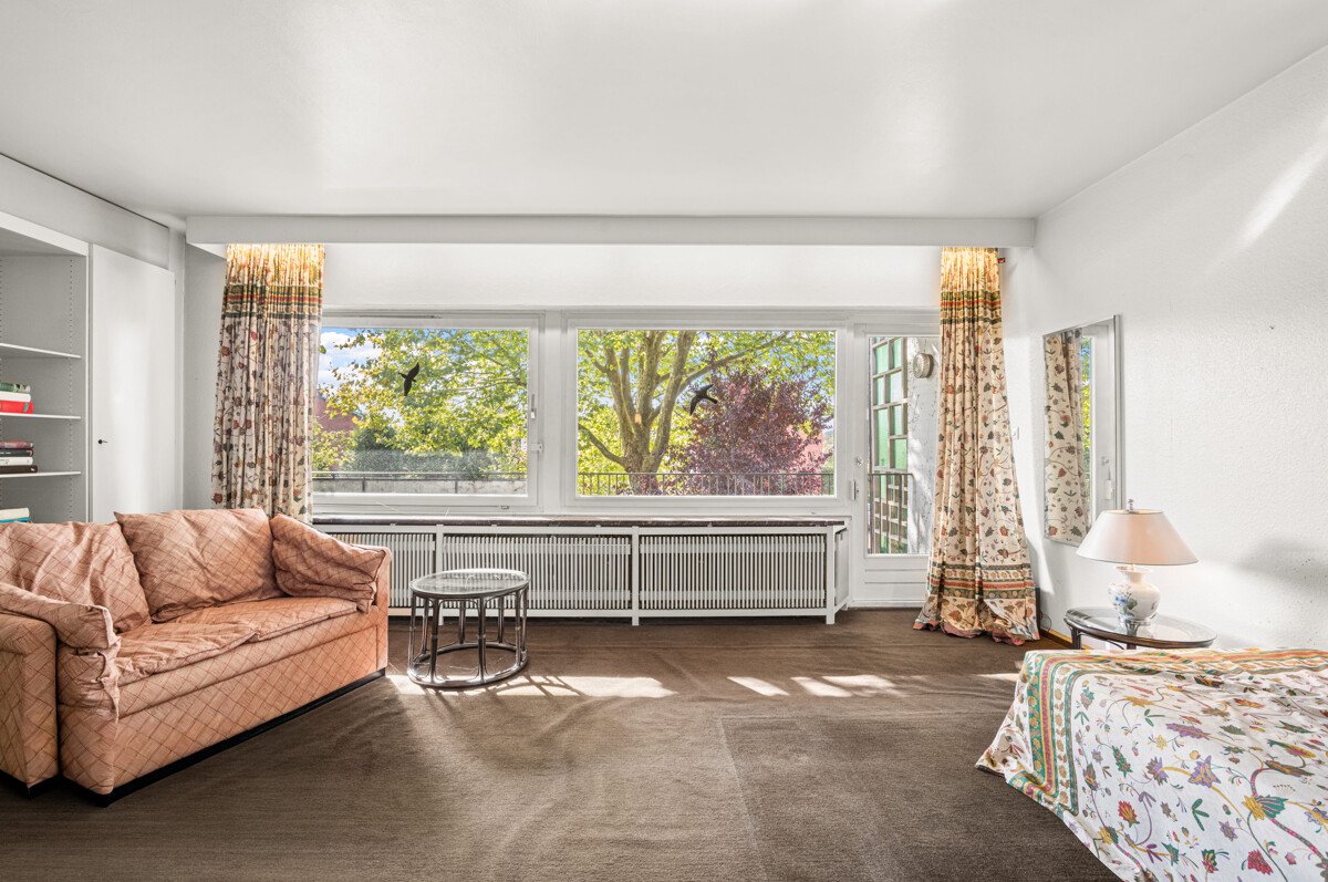 * Breite Fensterfront im Wohnzimmer