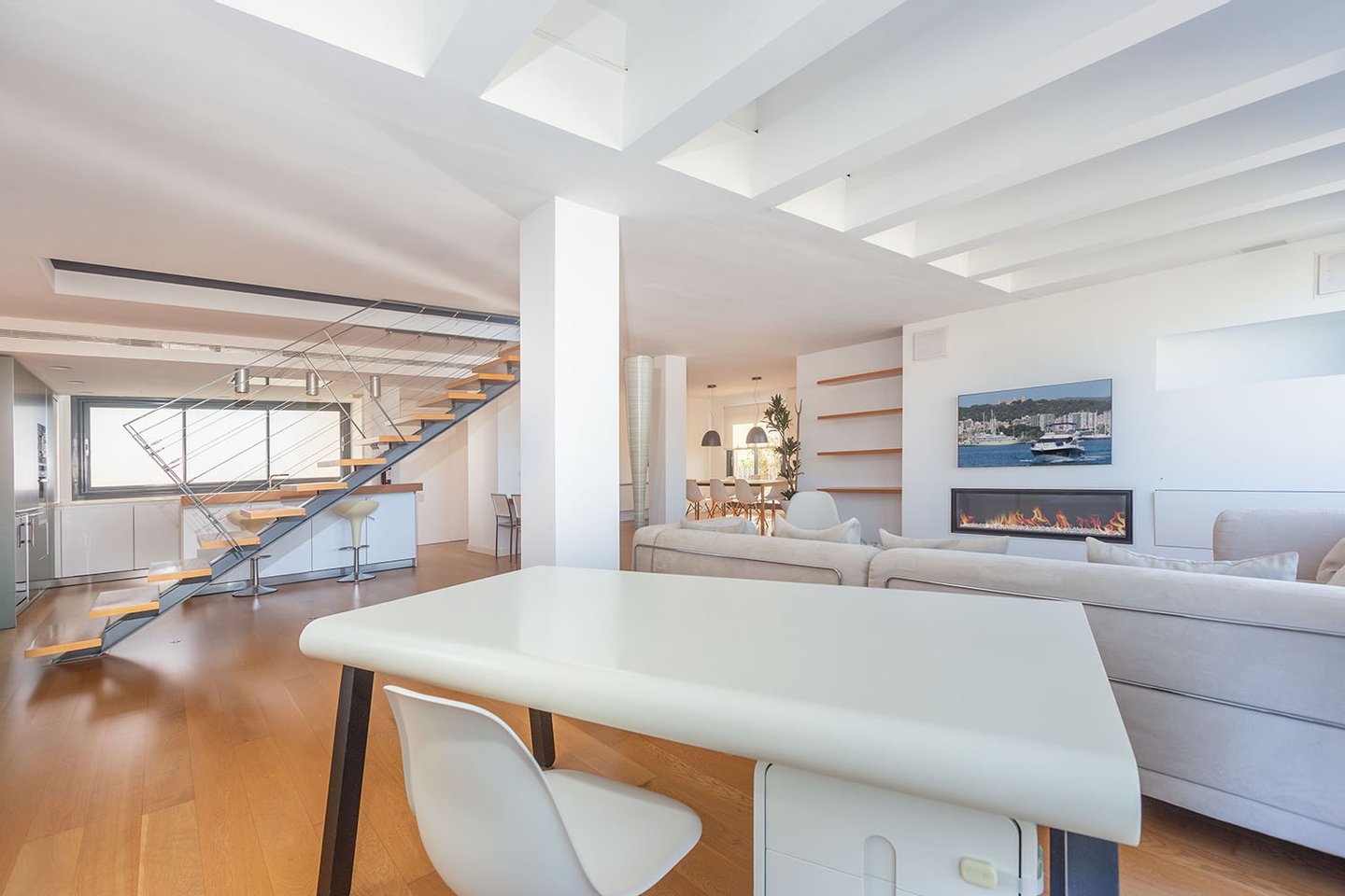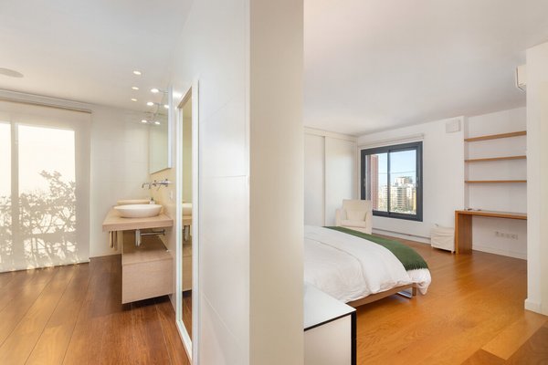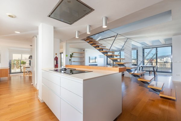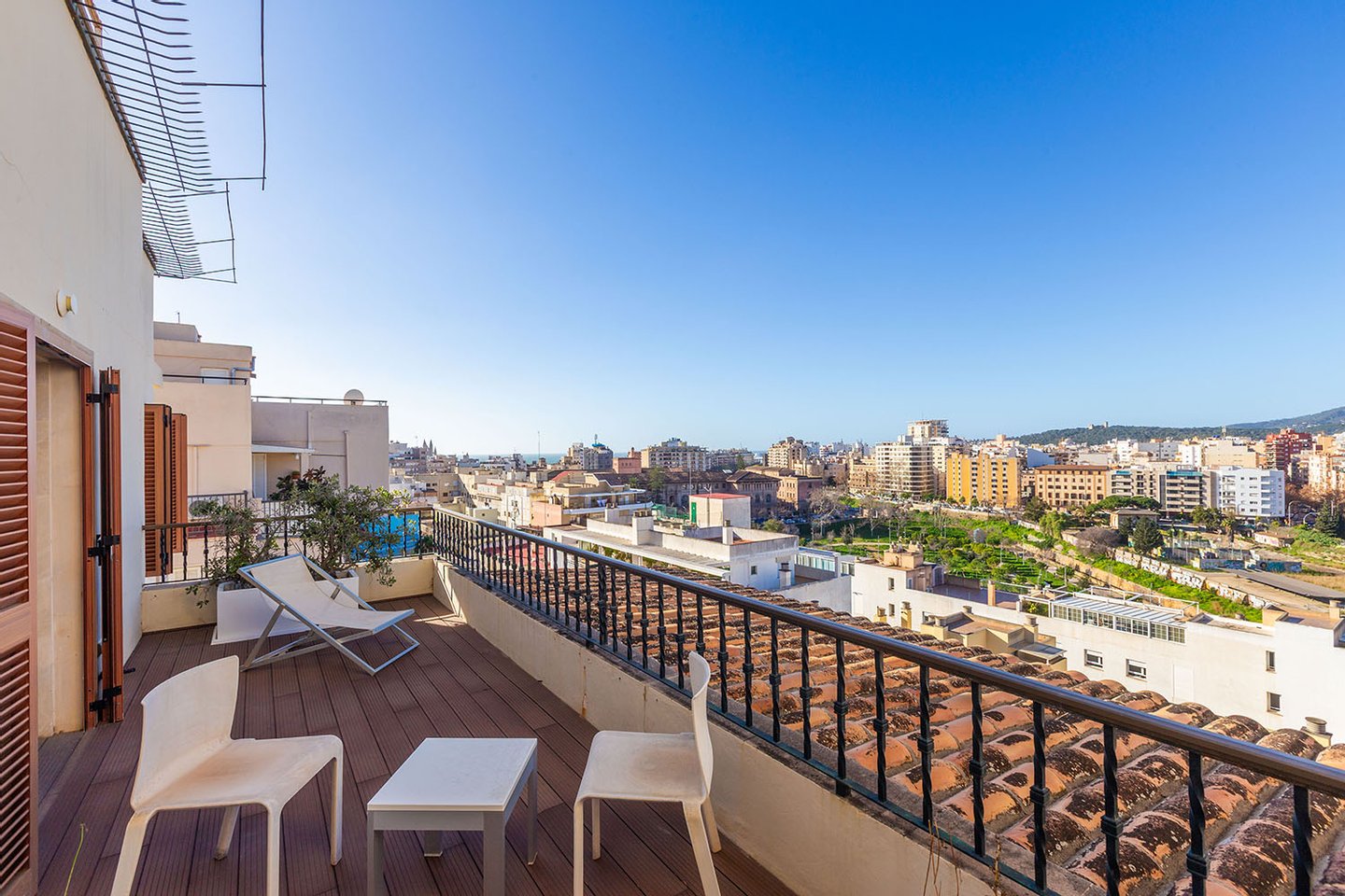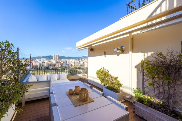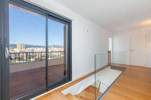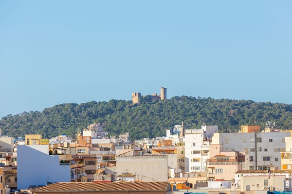 Die Wohnfläche erstreckt sich über zwei Etagen, jeweils mit großzügiger Terrasse, und wird durch die private, exklusiv nutzbare Dachterrasse ergänzt. Von allen Ebenen eröffnet sich ein beeindruckender Weitblick über die Stadt bis hin zum Meer und zum Castell de Bellver. Sämtliche Räume sind nach außen ausgerichtet und profitieren von außergewöhnlicher Helligkeit.