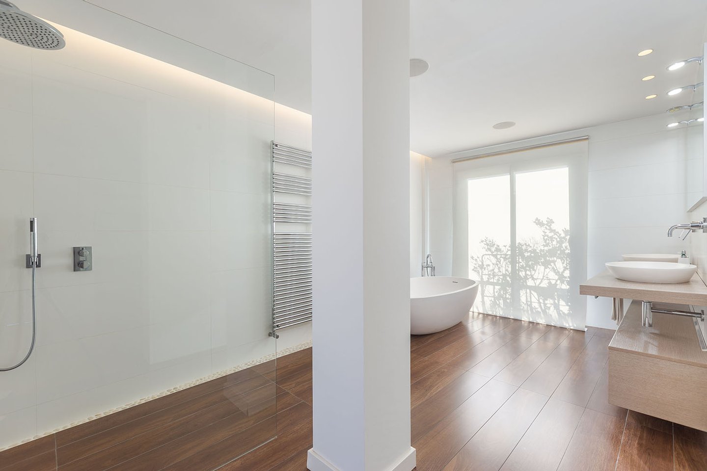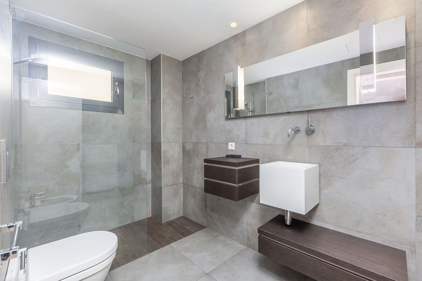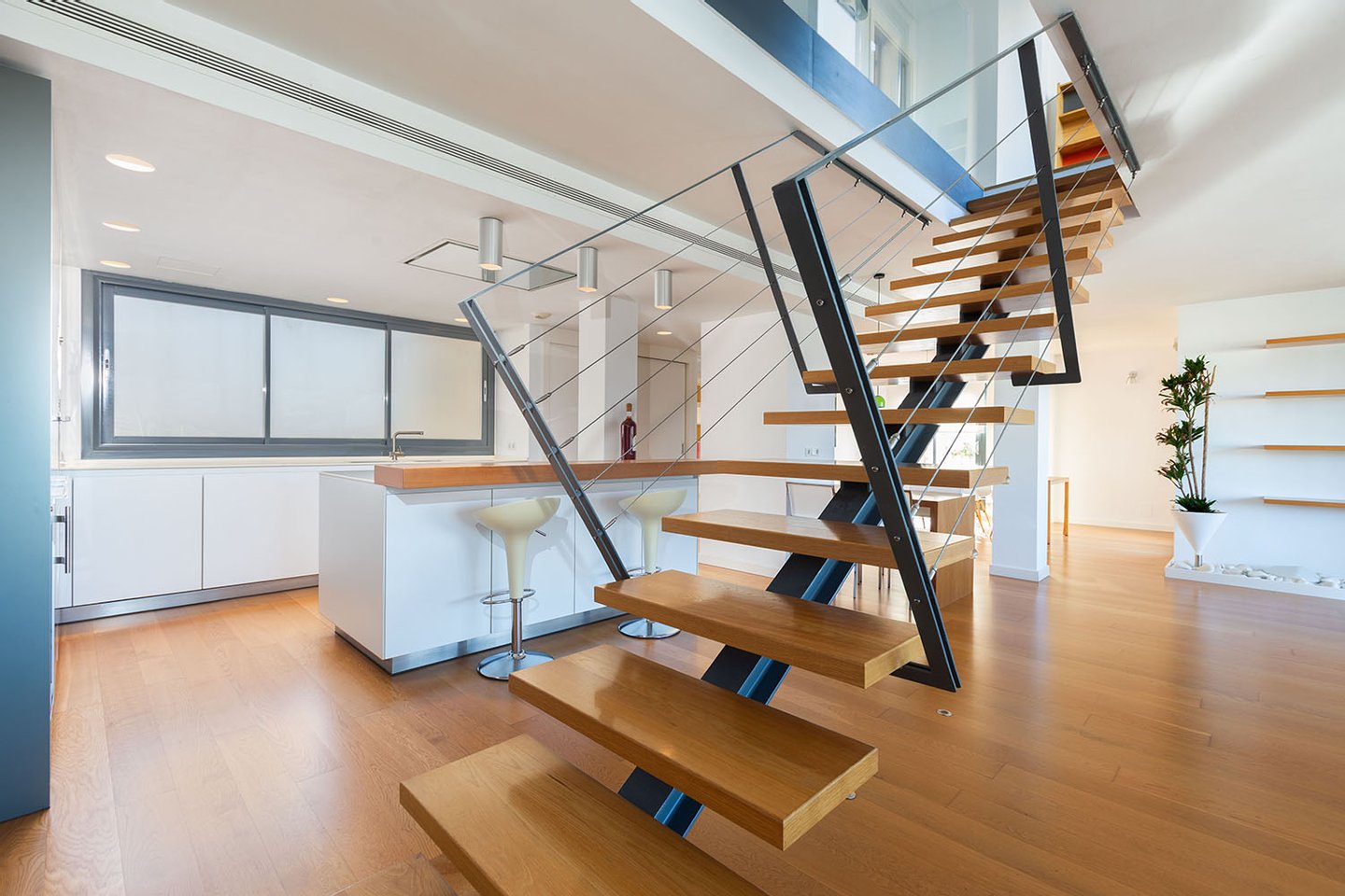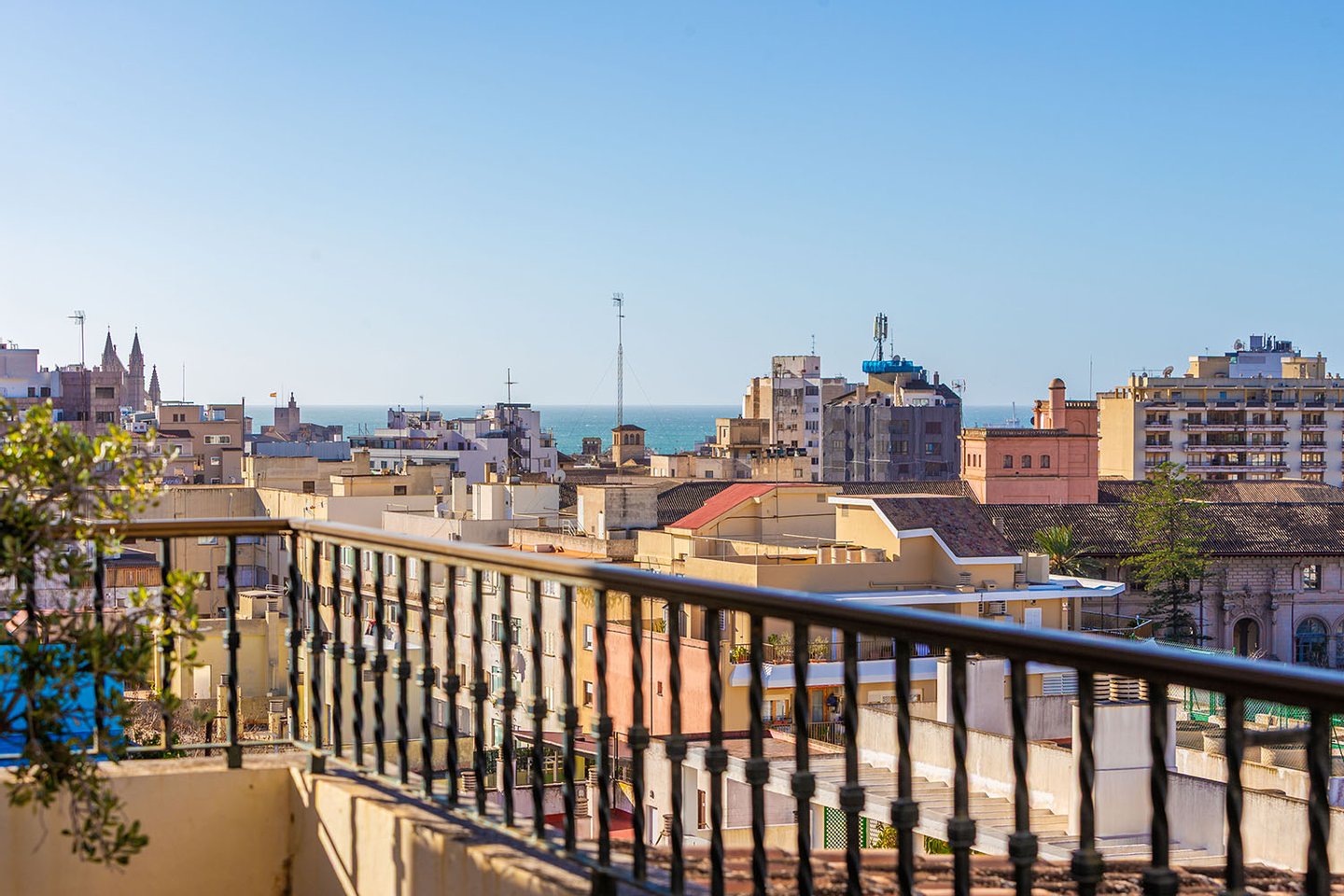 Die Wohnfläche erstreckt sich über zwei Etagen, jeweils mit großzügiger Terrasse, und wird durch die private, exklusiv nutzbare Dachterrasse ergänzt. Von allen Ebenen eröffnet sich ein beeindruckender Weitblick über die Stadt bis hin zum Meer und zum Castell de Bellver. Sämtliche Räume sind nach außen ausgerichtet und profitieren von außergewöhnlicher Helligkeit.