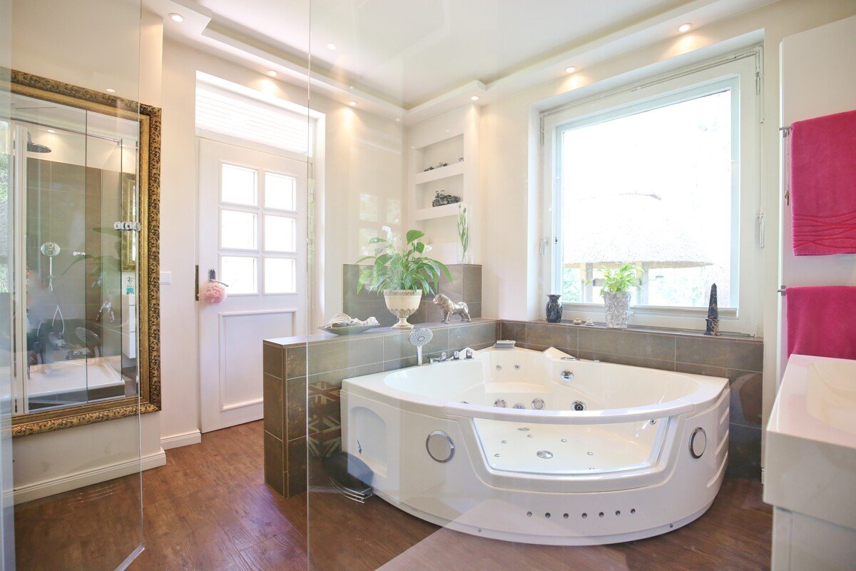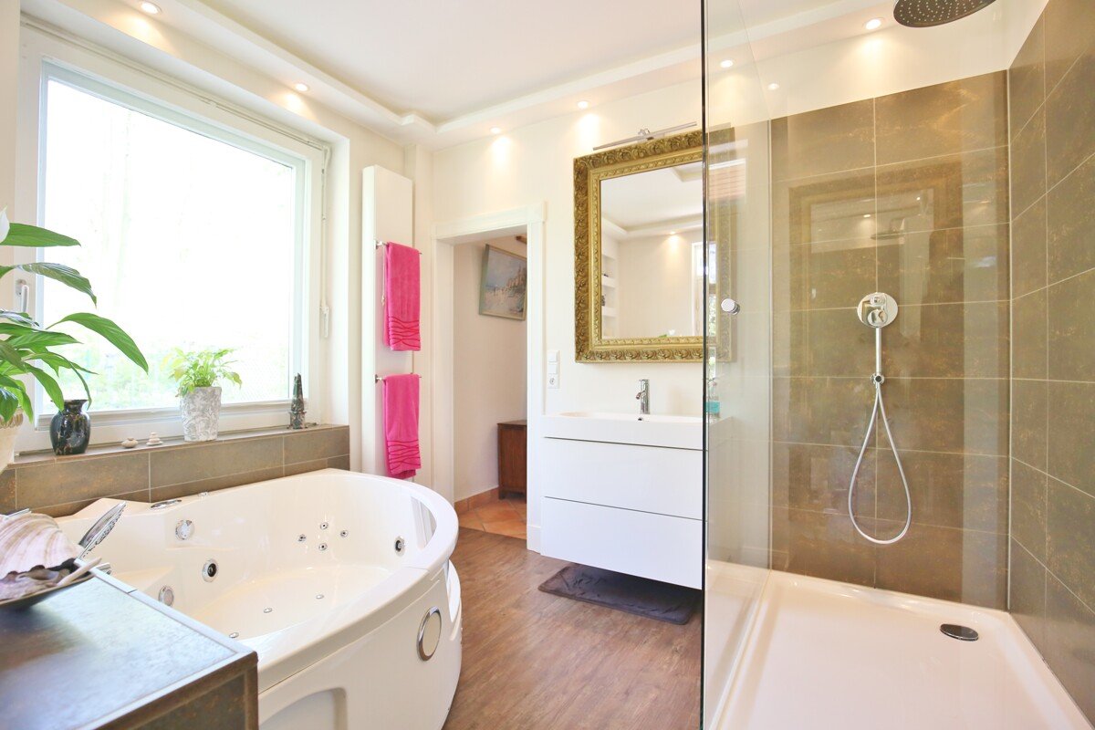 Sie können sich hier in dem mit ca. 209 m² Wohnfläche nach DIN und ca. 98 m² Nutzfläche repräsentativem Haus frei und ohne jede Einschränkung bewegen. Beispielsweise können Sie sich vom 2. Hauseingang bis zum Poolbereich bewegen, ohne jede Einsehbarkeit durch Nachbarn. Diverse Terrassen, Balkon oder Gartenhäuser sowie Garagen sind diesem aus Jahre 1897 entstandene Anwesen zugehörig. Das Reet wurde in 1984 und 2010 neu überdeckt, so dass es nun über hervorragende Isolierwerte verfügt.