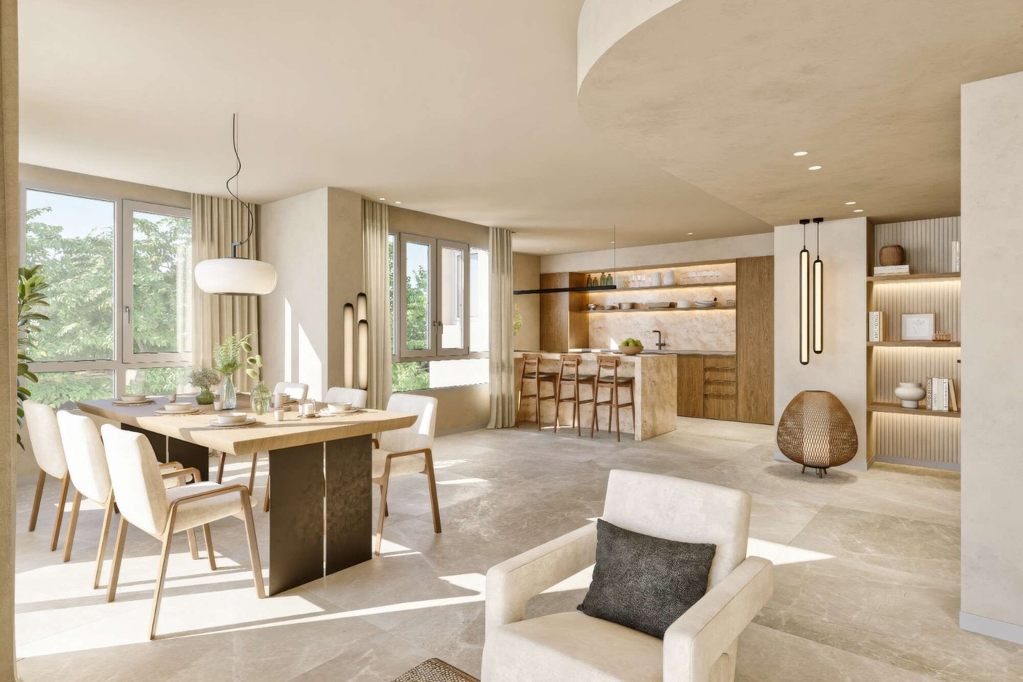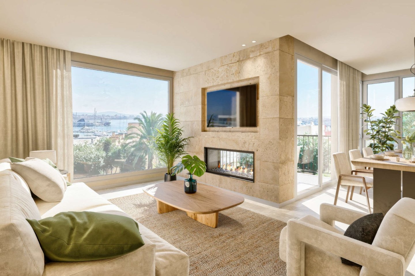 Der offen konzipierte Wohn- und Essbereich bildet das Herzstück der Wohnung. Ein integrierter Designer-Kamin, harmonisch kombiniert mit Naturstein- und Holzelementen, verleiht dem Raum eine warme und zugleich elegante Ausstrahlung.