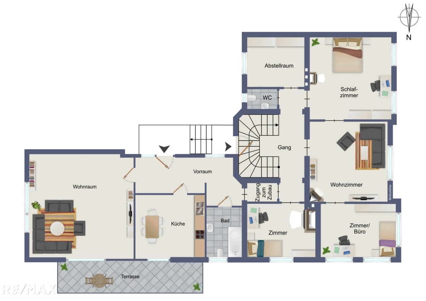 Der Altbau besticht durch seine großzügige Raumaufteilung: Sieben Zimmer, ein Abstellraum, zwei WCs und ein Badezimmer schaffen viel Raum für Familie, Hobbys und Homeoffice. Durchgänge im Erdgeschoss und Obergeschoss verbinden den Altbau nahtlos mit dem Zubau – ideal für alle, die Flexibilität und Offenheit im Wohnkonzept schätzen.
