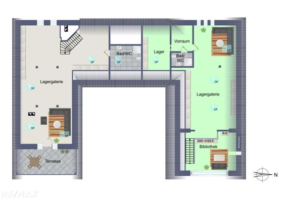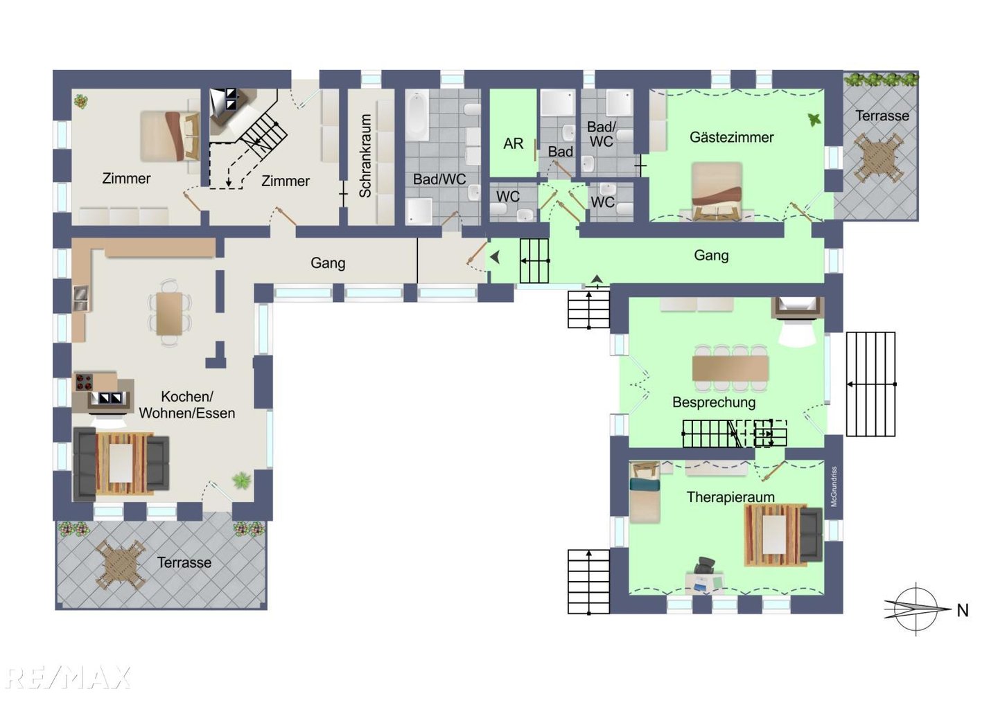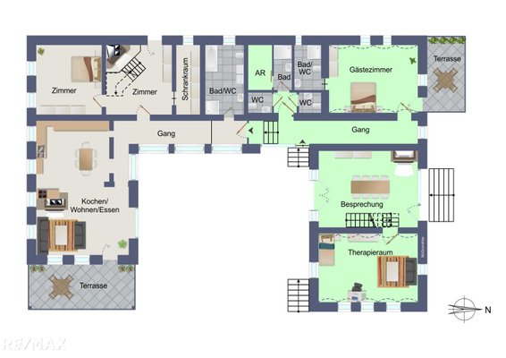 Die Flächen vom Haupthaus setzen sich aus ca. 198 m² Wohn- und Seminarflächen im Erdgeschoss und im ausgebauten Dachgeschoss aus ca. 195 m² Nutzfläche, welche als Lagerraum genehmigt sind zusammen.
