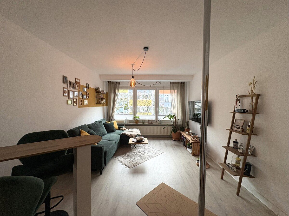 Von der Diele aus gelangen Sie in das großzügige Schlafzimmer, das moderne Badezimmer mit Duschwanne sowie in den gemütlichen Wohnbereich und in die separate Küche mit einem Zuganz zum Balkon. Die vorhandene Einbauküche kann gegen eine Abschlagszahlung vom Vormieter übernommen werden.
