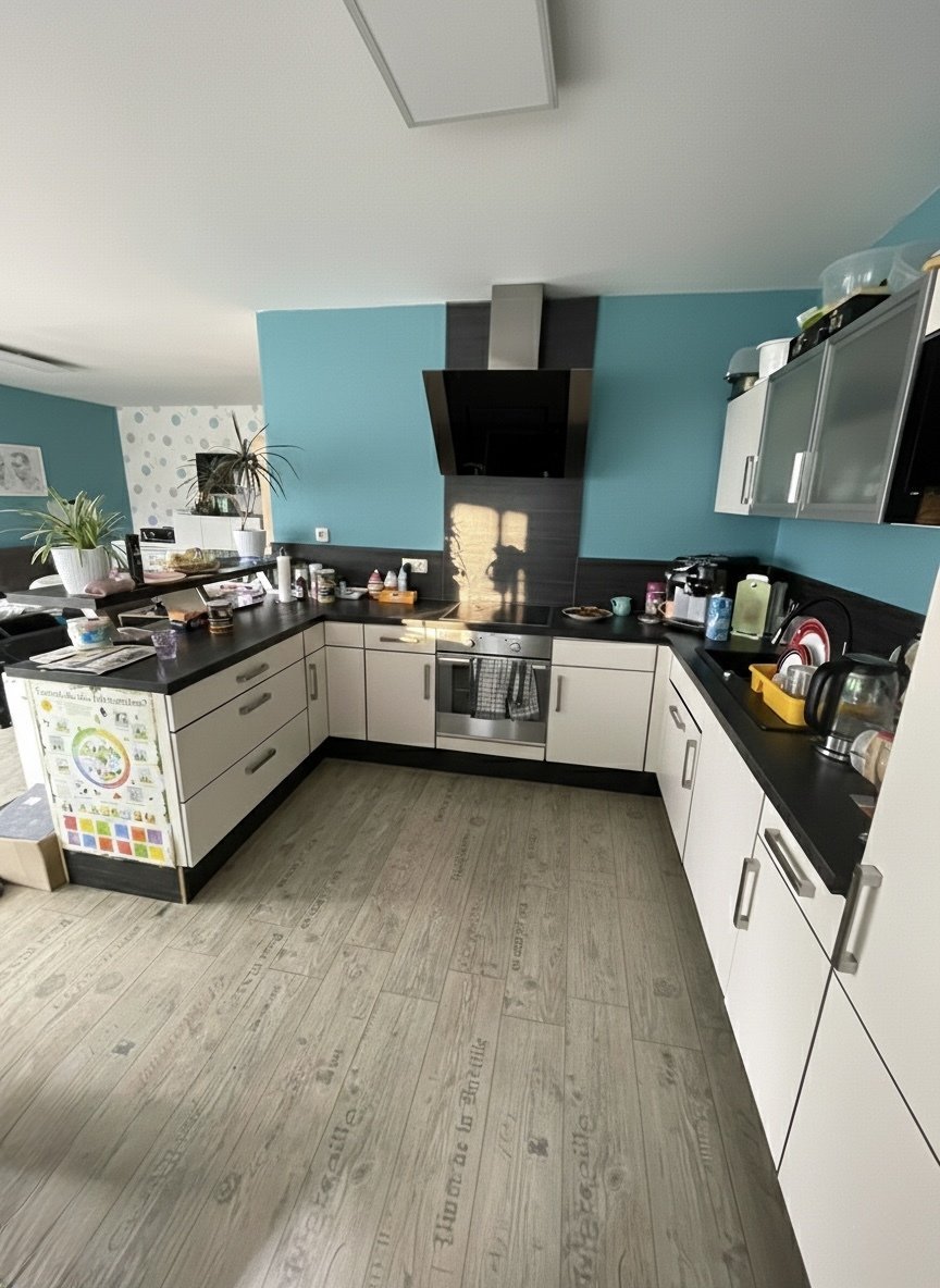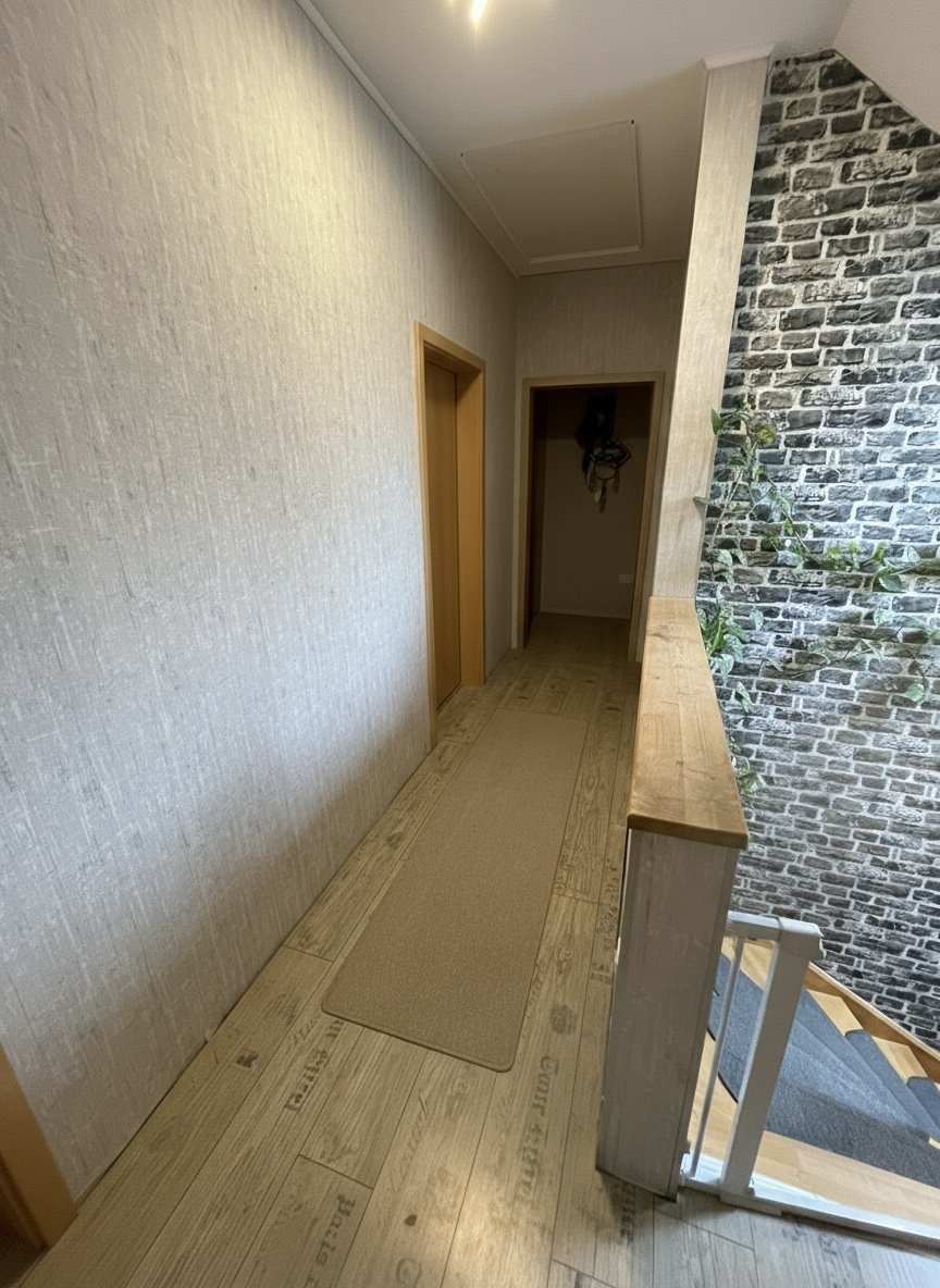 Die Bodenbeläge aus Fliesen, Laminat und Teppichboden bieten eine harmonische Kombination aus Funktionalität und Komfort. Fliesen sind pflegeleicht und ideal für den Eingangsbereich sowie die Badezimmer, während Laminat ein modernes Ambiente schafft und Teppichboden für Behaglichkeit sorgt.