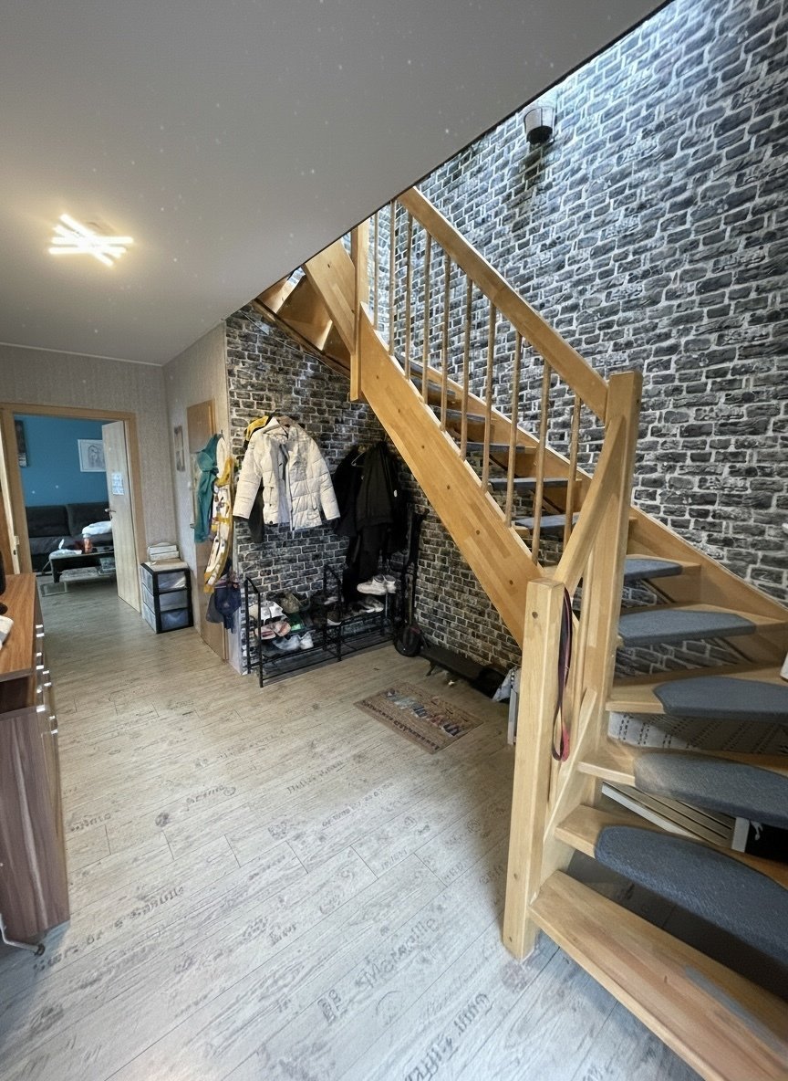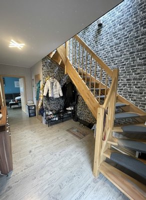 Die Bodenbeläge aus Fliesen, Laminat und Teppichboden bieten eine harmonische Kombination aus Funktionalität und Komfort. Fliesen sind pflegeleicht und ideal für den Eingangsbereich sowie die Badezimmer, während Laminat ein modernes Ambiente schafft und Teppichboden für Behaglichkeit sorgt.