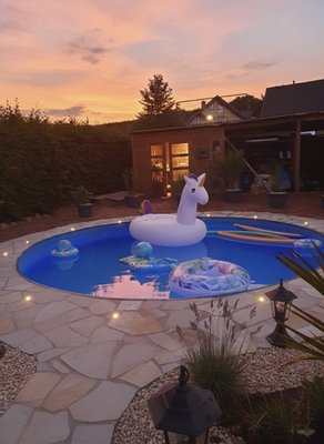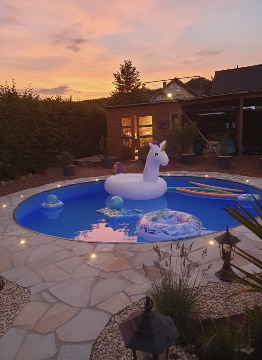 Das 827 m² große Grundstück lädt zum Spielen, Entspannen und Verweilen im Freien ein. Hier können Sie die warmen Sonnenstrahlen auf der Terrasse genießen oder im eigenen Garten in den Tag hineinträumen. Der Wohlfühlgarten ist mit Palmen bestückt und beherbergt zudem einen beheizten Pool.