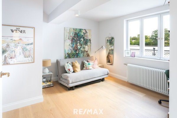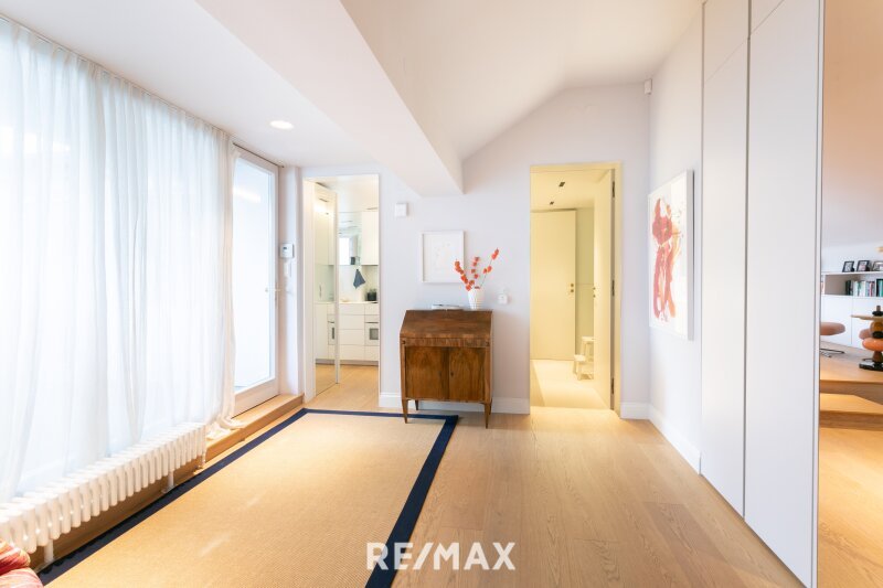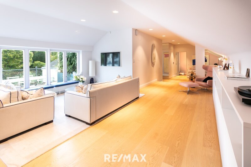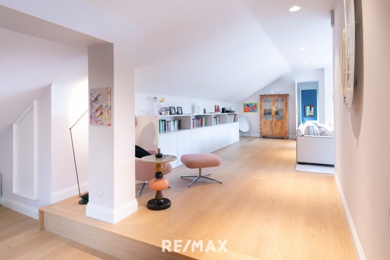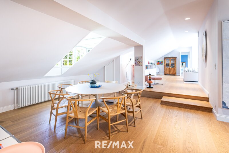 Die rund 197 m² große Wohnung erstreckt sich über das gesamte oberste Geschoß eines charmanten Biedermeierhauses und verbindet stilvolle Architektur mit höchstem Wohnkomfort.