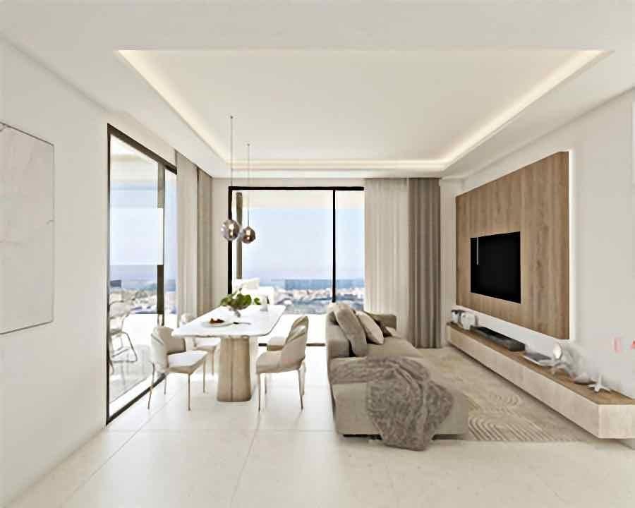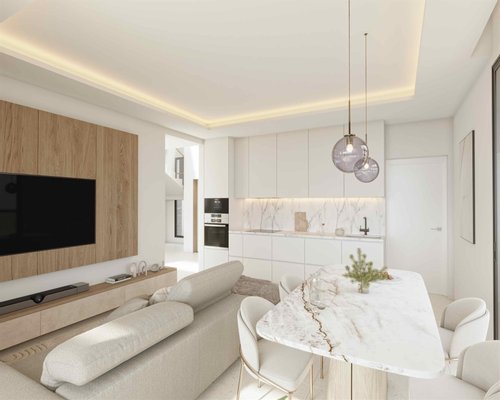 Küche, Esszimmer und Wohnzimmer sind auf einer Ebene miteinander verbunden, um einen einfachen Zugang und offene Flächen mit Panoramablick auf den Golfplatz und das Meer zu bieten.