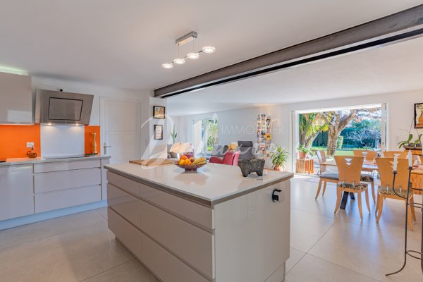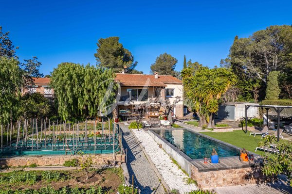 Outside, the flat, landscaped 2,070 sqm plot, meticulously maintained, offers a 10 x 4 metre saltwater swimming pool, a dedicated vegetable garden area, and a carport. This green haven is perfect for enjoying sunny days and the Mediterranean climate in complete privacy.