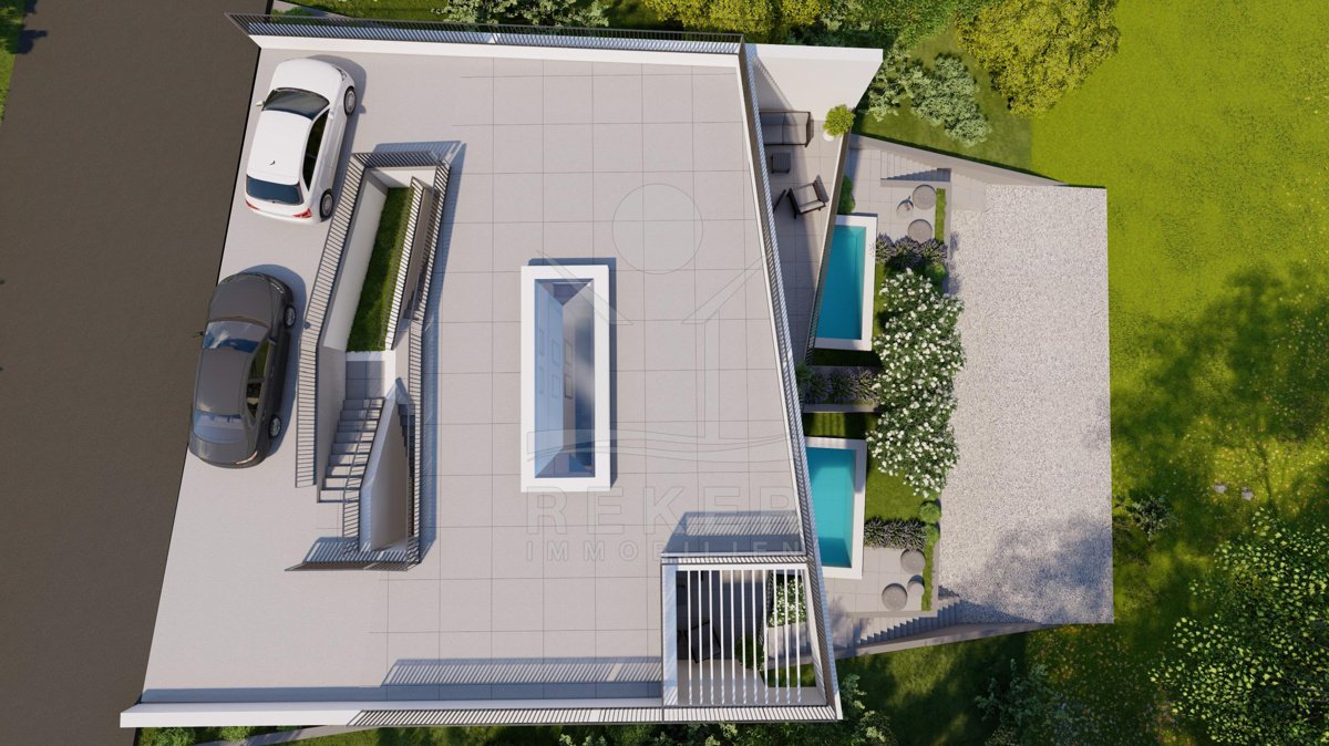 Zweite Meeresreihe, unverbaubarer Blick und nur 30 Meter bis zur Küste … diese Kombination ist selten. Zwei Terrassen mit Westausrichtung, ein Pool im geschützten Innenhof und ein offener Wohnbereich schaffen Raum für Erholung. Fertigstellung ist für