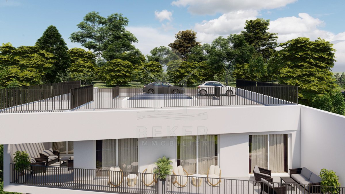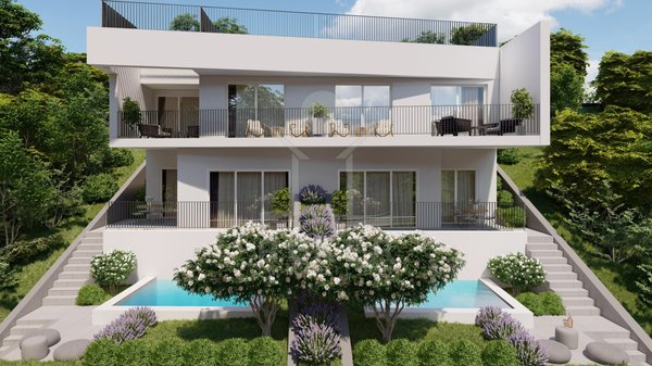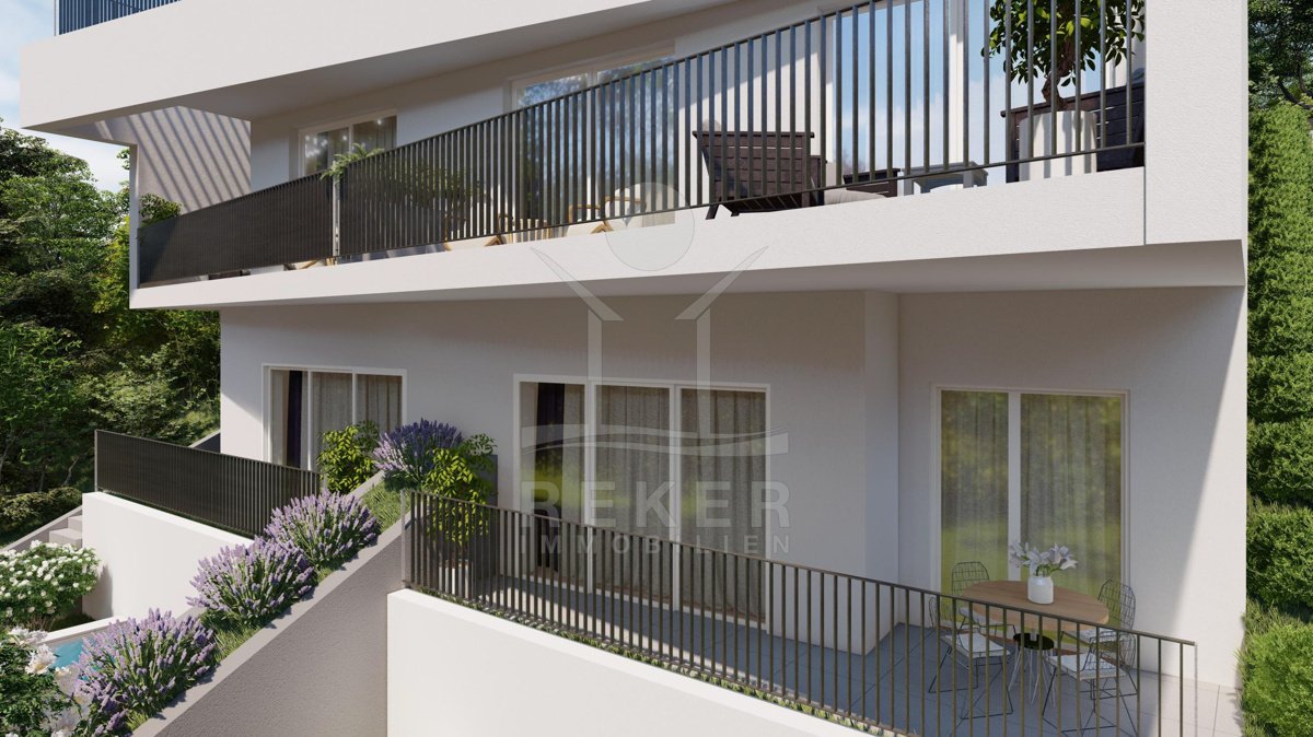 Zweite Meeresreihe, unverbaubarer Blick und nur 30 Meter bis zur Küste … diese Kombination ist selten. Zwei Terrassen mit Westausrichtung, ein Pool im geschützten Innenhof und ein offener Wohnbereich schaffen Raum für Erholung. Fertigstellung ist für 2026 geplant.