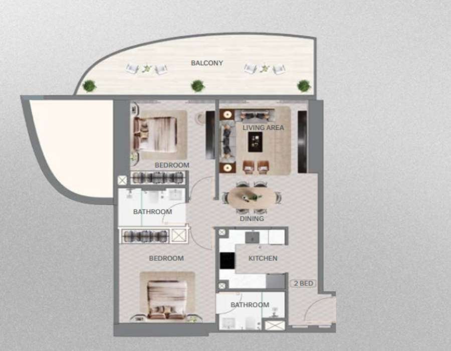 Wenn Sie dieses Apartment mit zwei Schlafzimmern in Mercedes-Benz Places by Binghatti betreten, werden Sie von einem Gefühl von Luxus und Raffinesse begrüßt. Der geräumige Wohnbereich mit raumhohen Fenstern bietet einen atemberaubenden Blick auf die