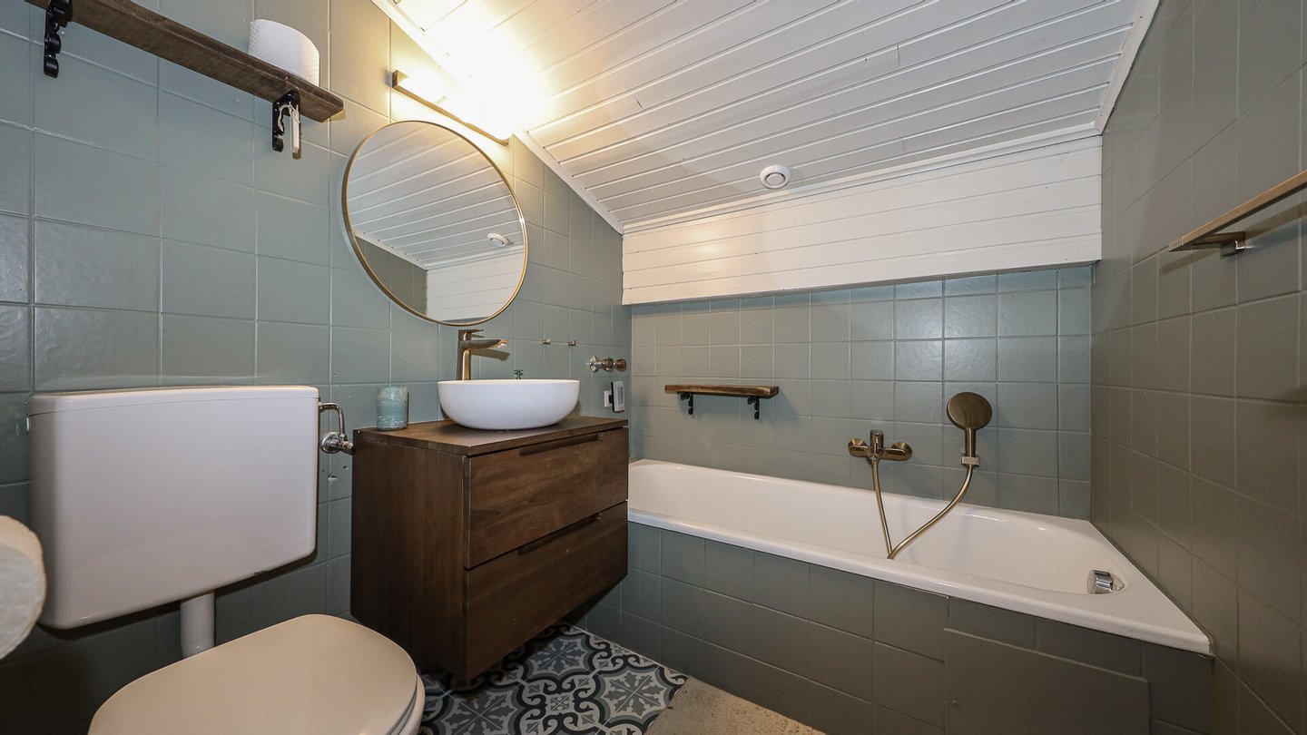 Mit dem Lift erreicht man die Wohnung im Dachgeschoss des Hauses und betritt die Diele, von wo ein Abstellraum sowie das Badezimmer mit Wanne, Handwaschbecken und WC erreichbar sind.