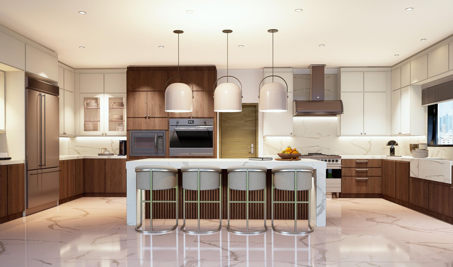 - Vier Schlafzimmer, jedes mit eigenem Bad und begehbarem Kleiderschrank.