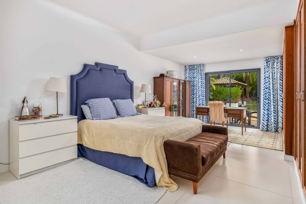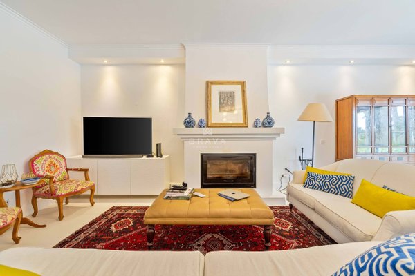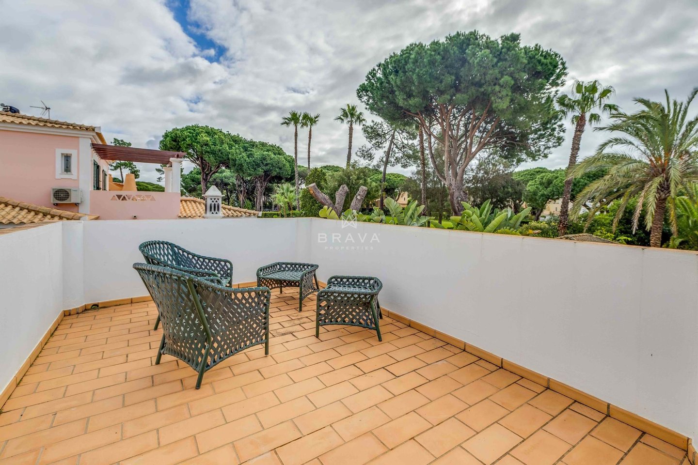 Eine Villa mit vier Schlafzimmern befindet sich in Vilamoura, auf einem eigenständigen Grundstück mit 784 m² und 250 m² Bodenfläche, vor dem Golfplatz gelegen. Es erstreckt sich über das Erdgeschoss und das erste Stockwerk und verfügt über mehrere Terrassen für private Nutzung, Schwimmbad, Garten und Grillbereich.