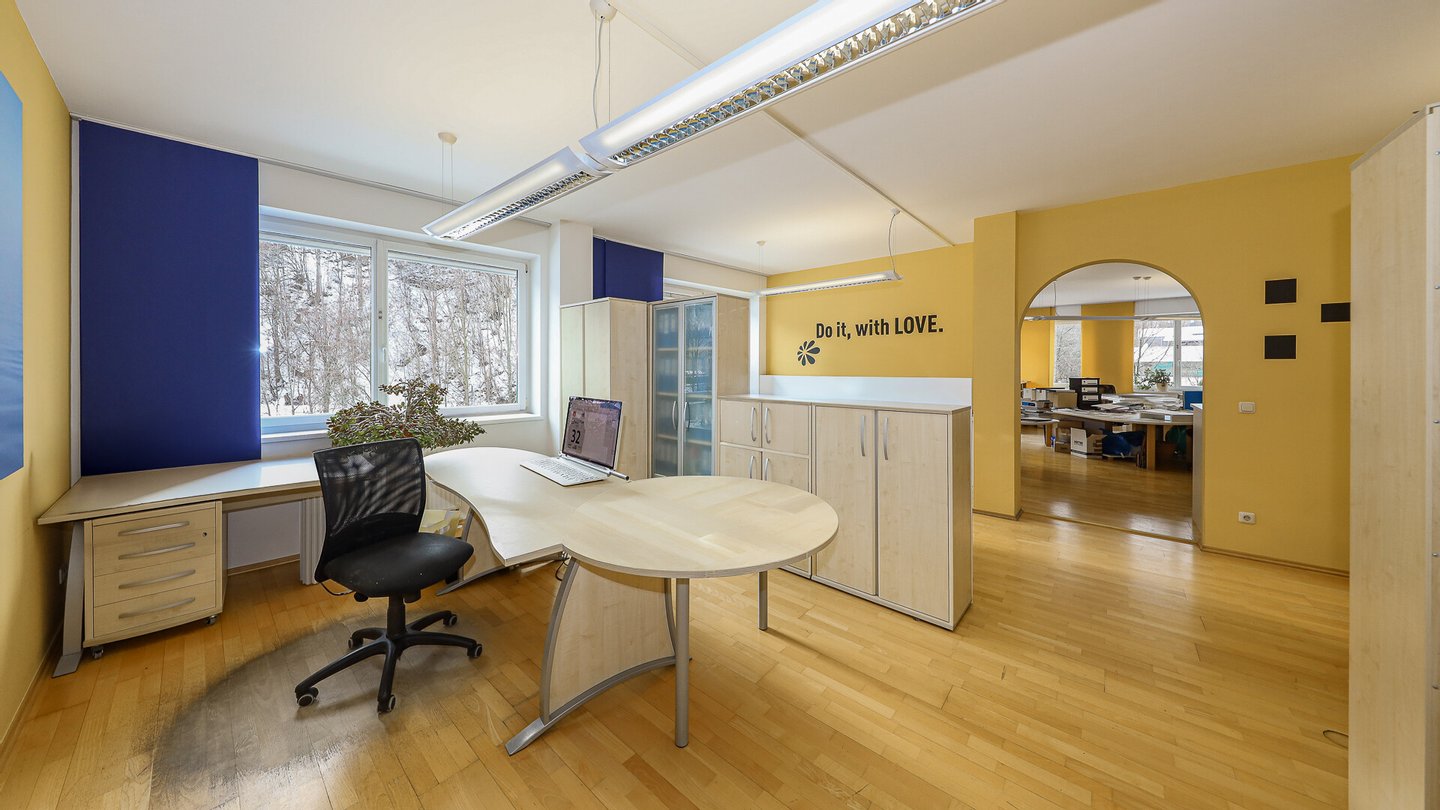 Die zum Verkauf stehenden Büros befinden sich im Hochparterre des Gebäudes (Baujahr 2001) und blicken im wesentlichen ins Grüne und Richtung Kitzbüheler Ache (Fluss).