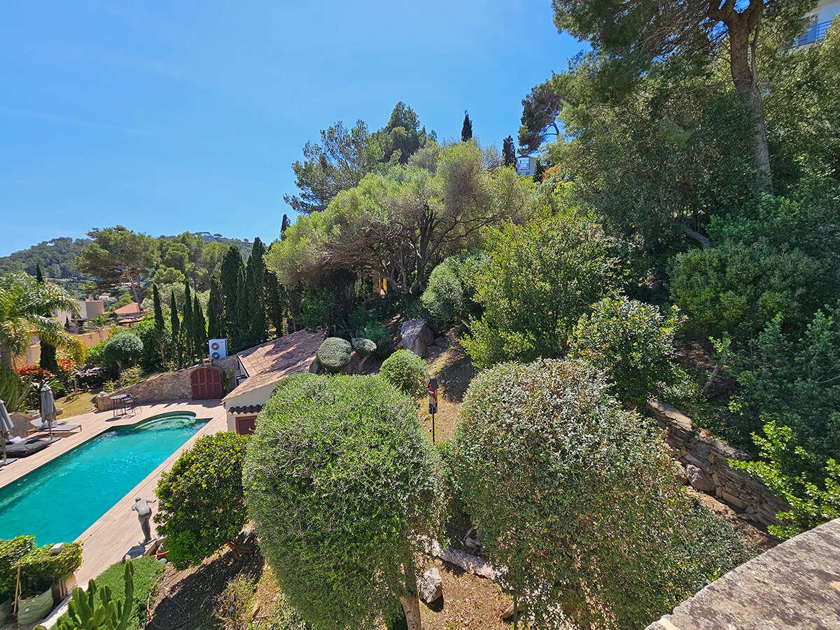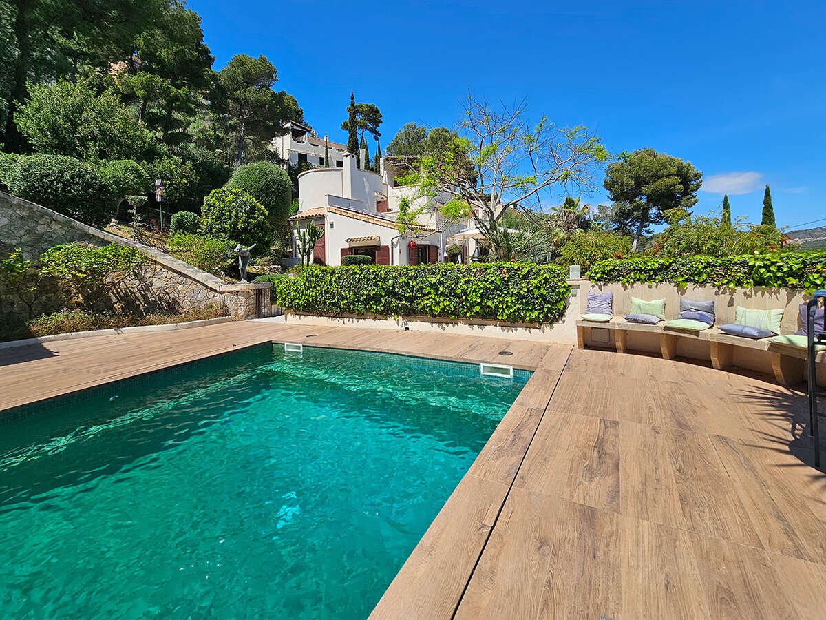 Der großzügige Pool (12 × 5 m) lädt zum Schwimmen und Entspannen ein. Direkt angrenzend bietet ein charmantes Poolhaus mit Sommerküche, BBQ-Bereich und zusätzlichem Außenbad ideale Voraussetzungen für das Leben im Freien. Mehrere Terrassen und ein liebevoll angelegter, mediterraner Garten schenken Raum zum Genießen und Verweilen. Auf der Dachterrasse eröffnet sich Ihnen ein herrlicher Panoramablick auf das Meer. Ergänzt wird das Anwesen durch ein weiteres Grundstück mit rund 800 m² Fläche.