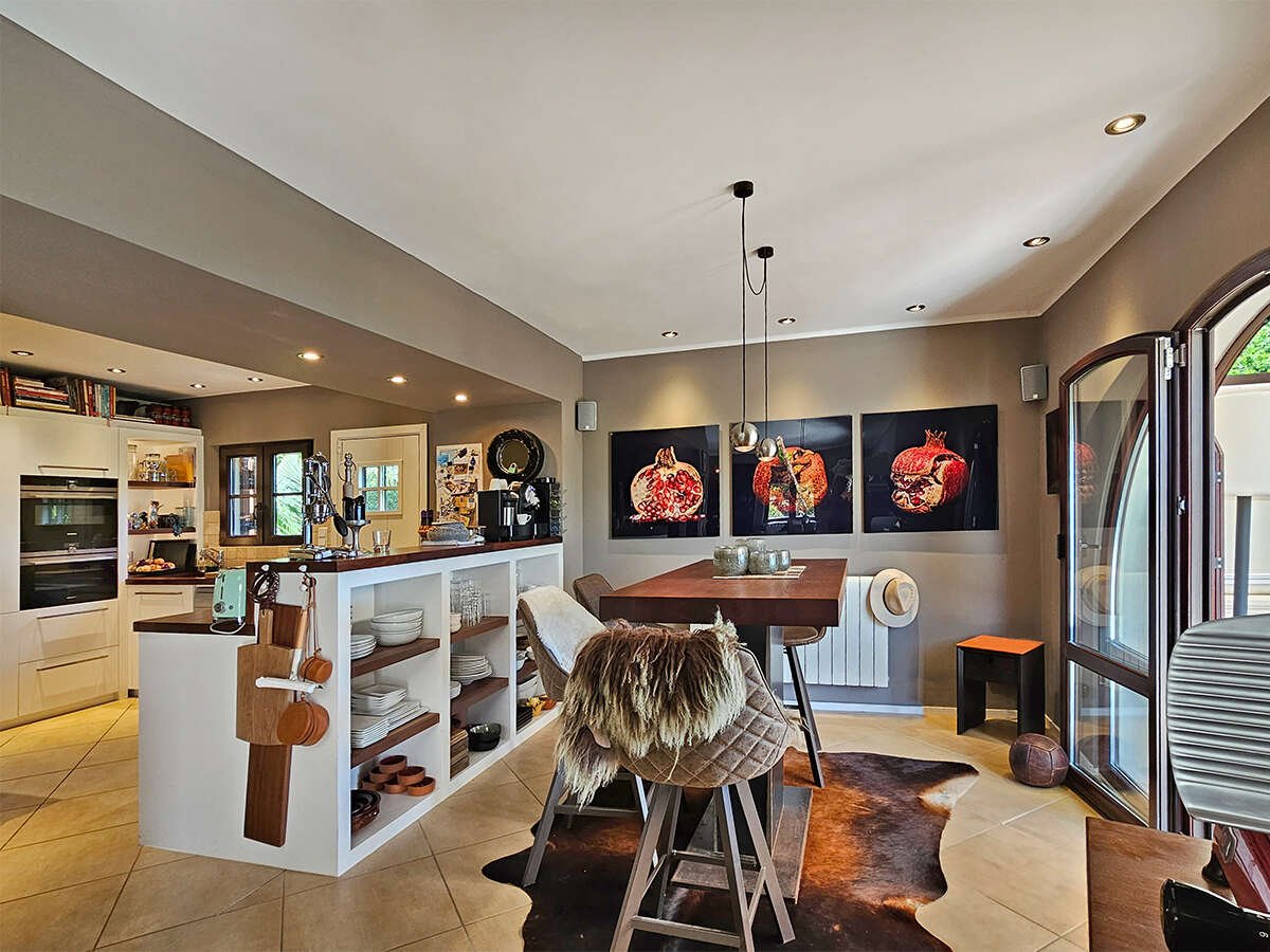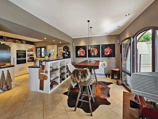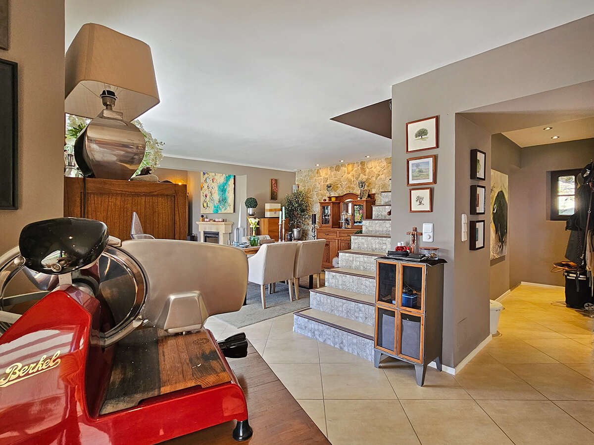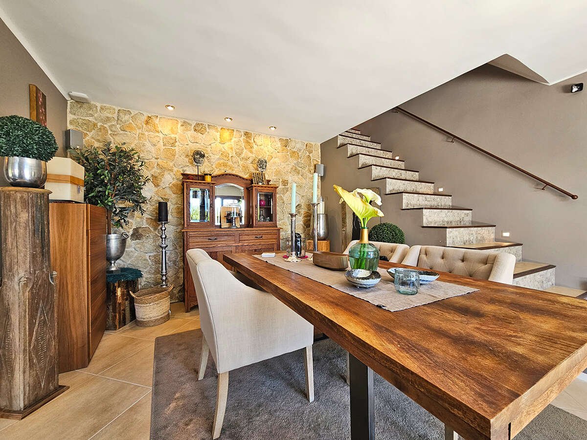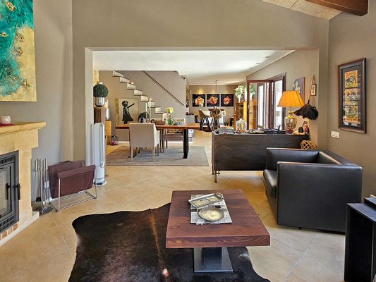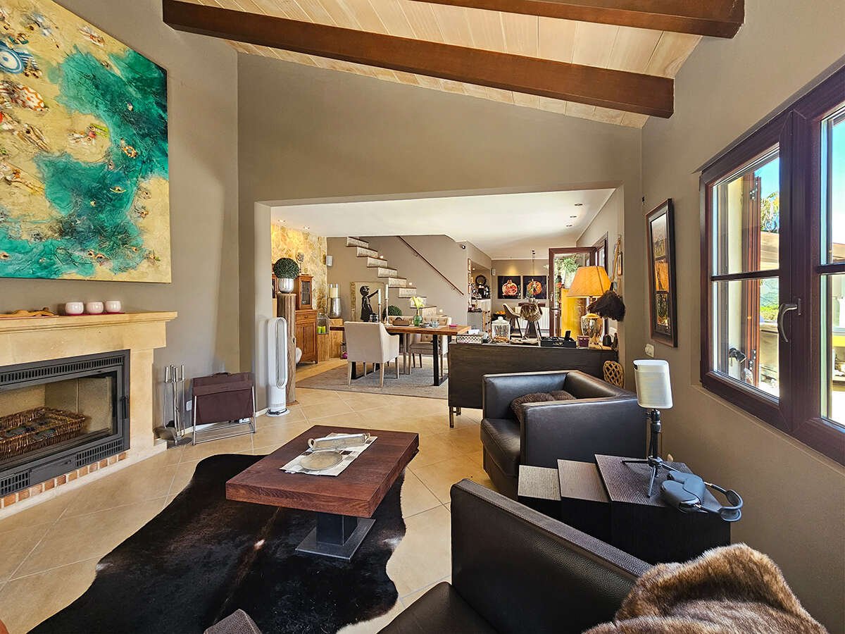 Der offene Wohnbereich mit Kamin, Essplatz und moderner Küche schafft eine einladende Atmosphäre für gesellige Stunden. Eine zentrale Öl-Heizung sorgt für wohlige Wärme, während die Fußbodenheizung im gesamten Haus zusätzlichen Komfort bietet. In den Schlafzimmern garantieren Klimaanlagen angenehme Temperaturen auch an heißen Sommertagen.