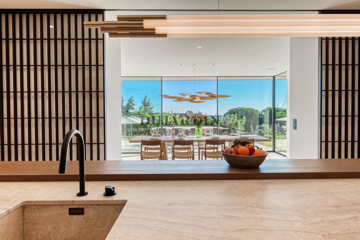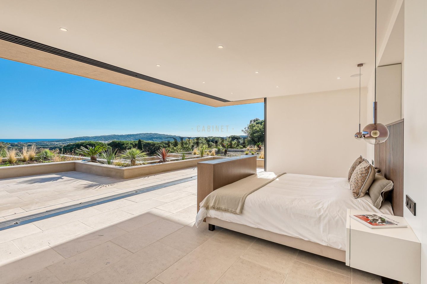 Gekennzeichnet durch ein modernes mediterranes Lebensgefühl bietet die Villa großzügige Empfangsbereiche, die auf Terrassen, den Pool und das Meer hinaus geöffnet sind, in einer perfekt abgestimmten Innen-außen-Verbindung.