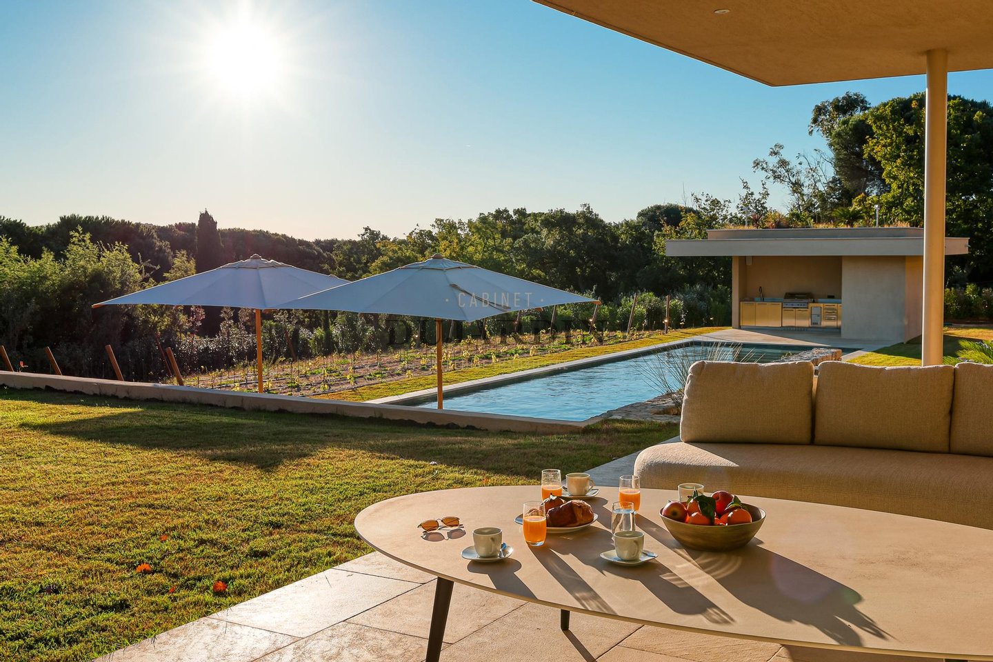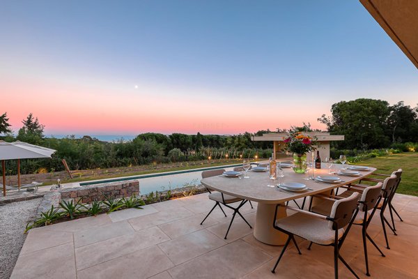 In einer der begehrtesten Lagen der Halbinsel Saint-Tropez gelegen, fügt sich diese zeitgenössische Villa in Ramatuelle mitten in eine unberührte Landschaft zwischen Weinbergen, Hügeln und mediterranem Küstengebiet ein, nur wenige Minuten von den Pampelonne-Stränden entfernt.